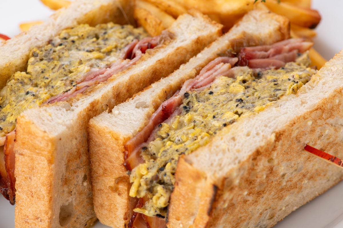 トリュフ&チーズスクランブルエッグとベイクドベーコンのサンドウィッチ