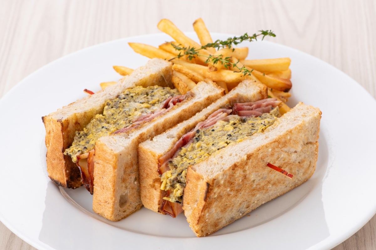 また、セイボリーアイテムとして、ヒマラヤトリュフ、ホワイトチェダーと共にふわふわに仕上げたスクランブルエッグと、香ばしいベイクドベーコン、甘さを引き出し丁寧にソテーしたオニオンをグレインブレッドでサンドした「トリュフ&チーズスクランブルエッグとベイクドベーコンのサンドウィッチ」をご用意しました。たっぷりのポテトとともに、豪快に頬張ってお召し上がりください。