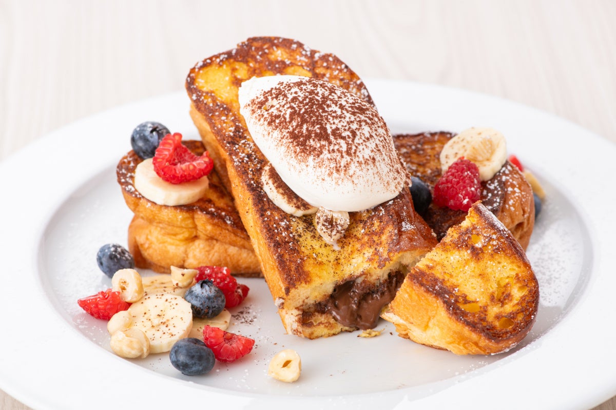 「ジャンドゥーヤフレンチトースト」は、ヘーゼルナッツのプラリネペーストをあわせたジャンドゥーヤチョコレートを、ふんわりした食感と卵とバターの風味が楽しめるサラベス特製ハッラーブレッドでサンドして焼き上げたフレンチトースト。中からとろけ出る熱々のジャンドゥーヤチョコレートにはクッキーをフレーク状にしたロイヤルティーヌを加え、サクサクとした食感と香ばしい風味を心地いいアクセントにしています。たっぷりのホイップクリームとベリー、バナナ、ヘーゼルナッツのトッピングと一緒にお楽しみください。