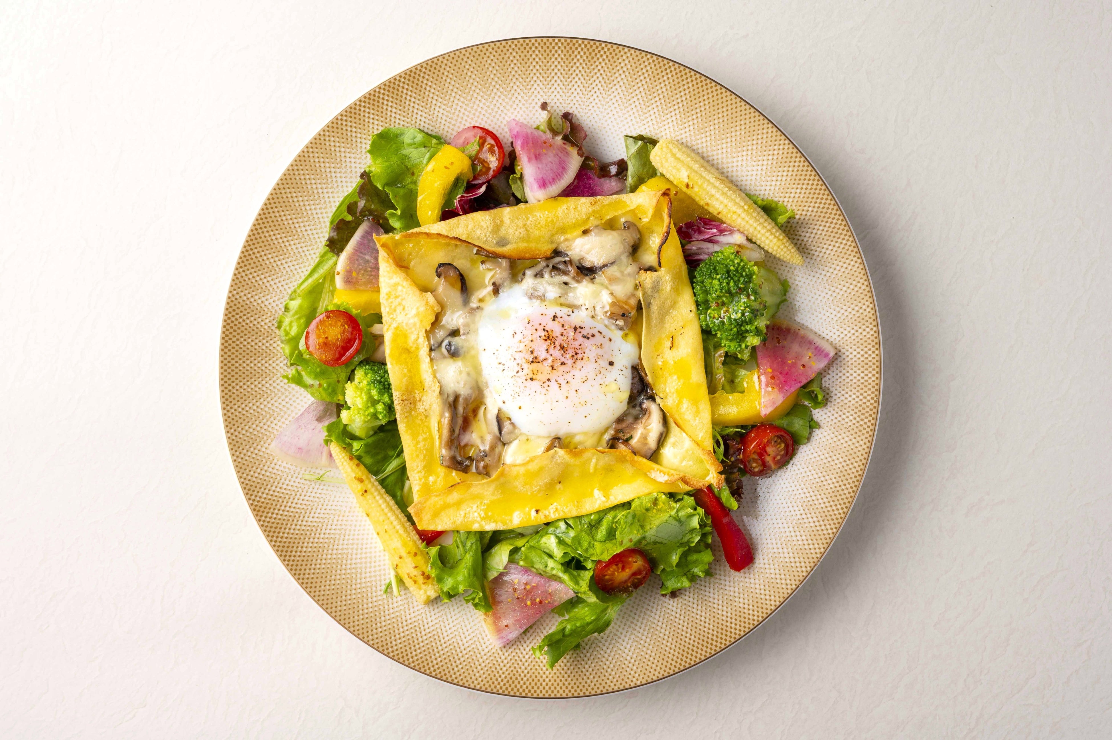 心と体が喜ぶ安心でヘルシーなお食事をご用意いたしました。もっちりとした食感が魅力の米粉のガレットです。ベーコン、きのこのソテー、ほうれん草、卵を包み込みました。サニーレタス、ケール、パプリカ、トマト、紅芯大根などたっぷりの野菜がプレートを彩ります。健康志向の方におすすめです。