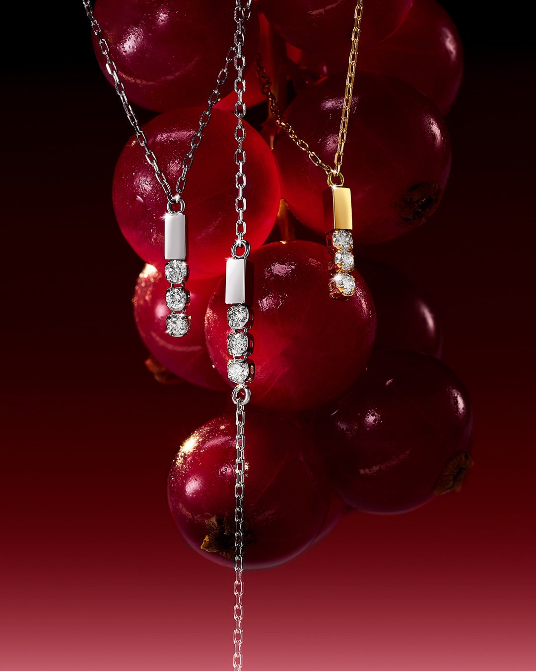 写真右・左&右:「シャンデリア ライン プチ ネックレス」各74,800円、Pt ,YG / ダイヤモンド、写真右・中央:「シャンデリア ライン プチ ブレスレット」71,500円、Pt / ダイヤモンド