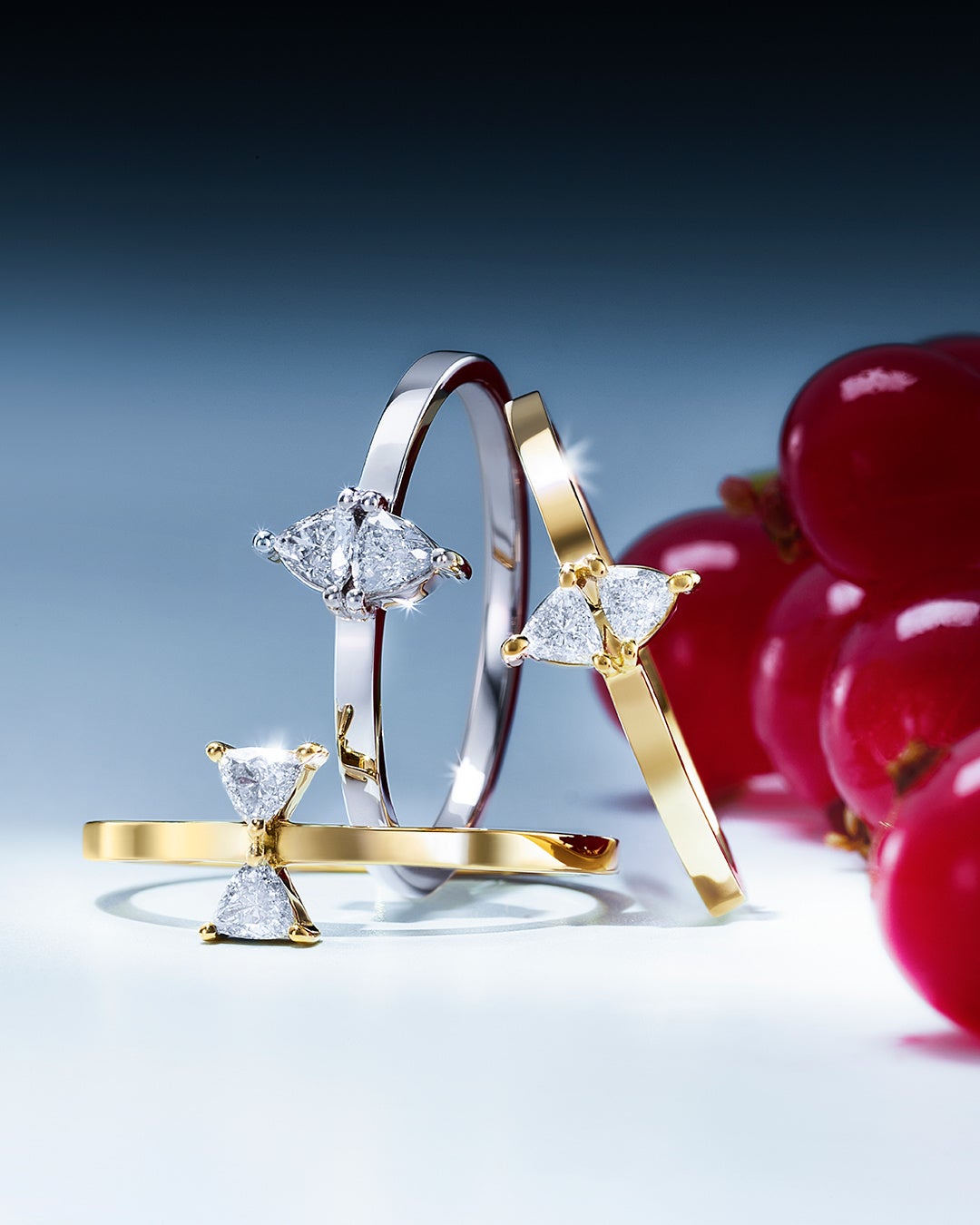シャープな煌めきを放つトリリアントカットダイヤモンドを2石セッティングしたひし形フォルムが特徴の“セブロン ロサンジュ”。凛としたプラチナの輝きは、ダイヤモンドの魅力を一層惹きたて、冬の澄み切った空に輝く星のように、人々の心を惹きつけます。