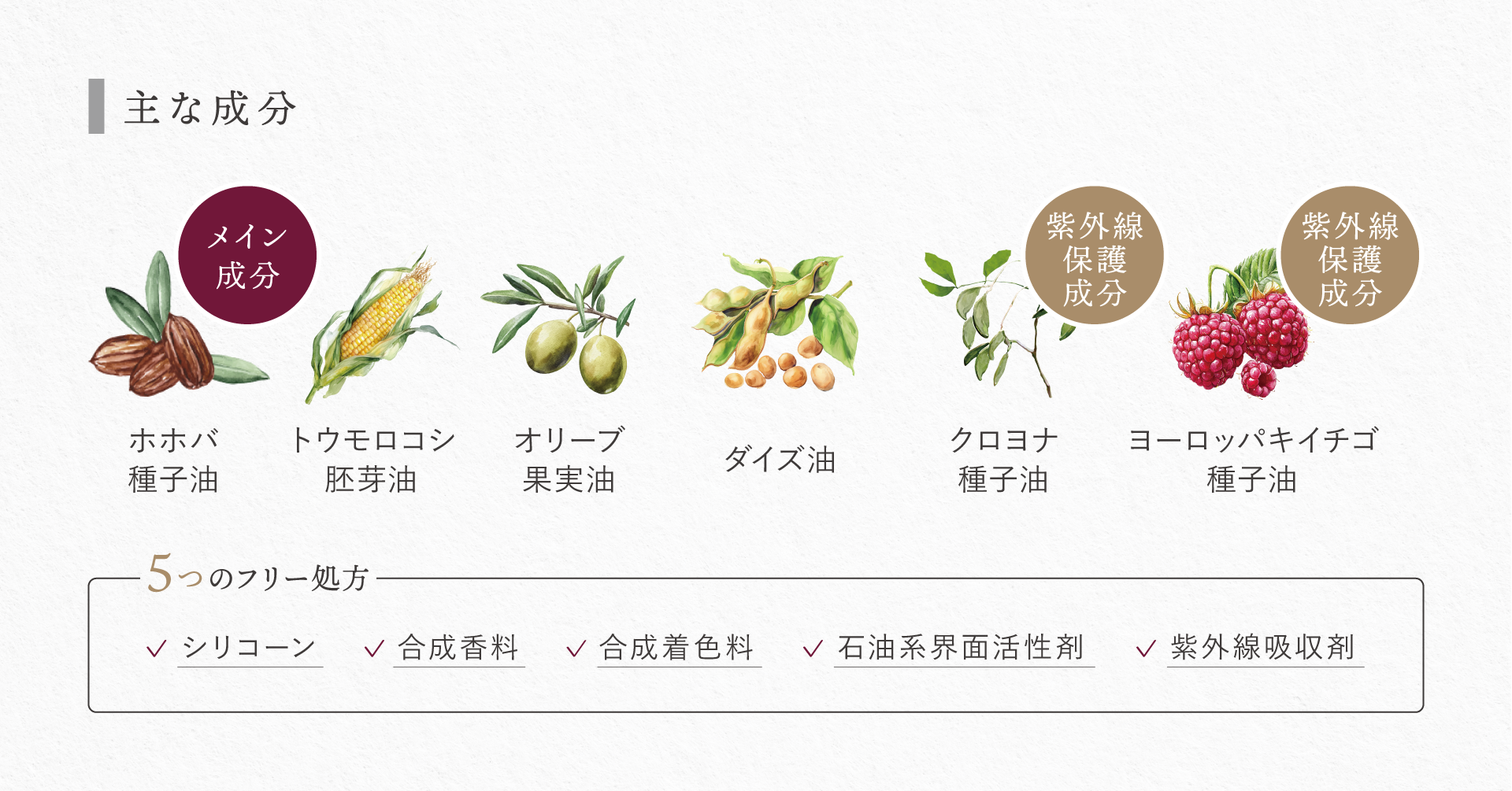 ホホバ種子油、トウモロコシ胚芽油、オリーブ果実油、クロヨナ種子油、ヨーロッパキイチゴ種子油、大豆油、トコフェロール(ビタミンEの一種)