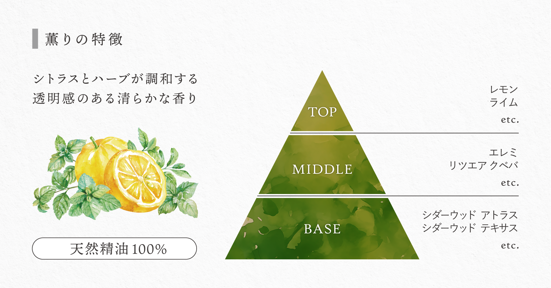 柑橘系(レモン、ライム、オレンジ)とシダーウッドを基調に、さまざまなシーンに調和する香りへとまとめ上げました。
