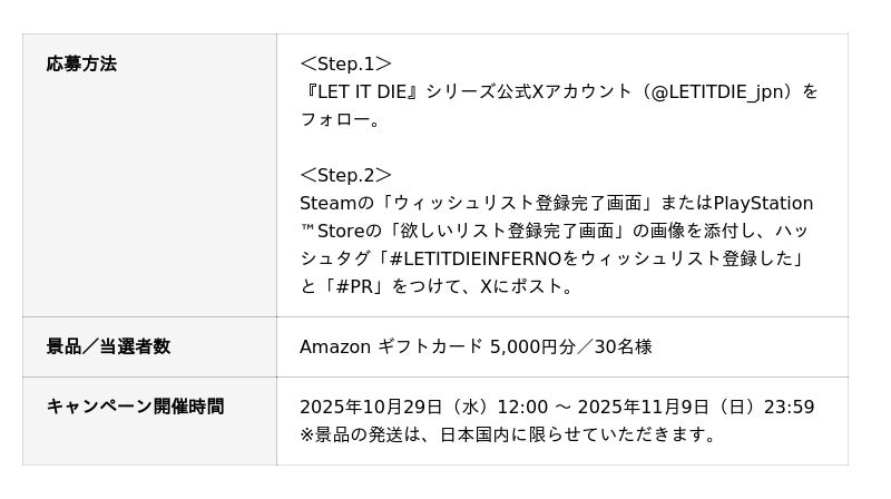 【LET IT DIE: INFERNO】Amazonギフトカード5,000円分が当たる!「ウィッシュリスト登録Xキャンペーン」開始!