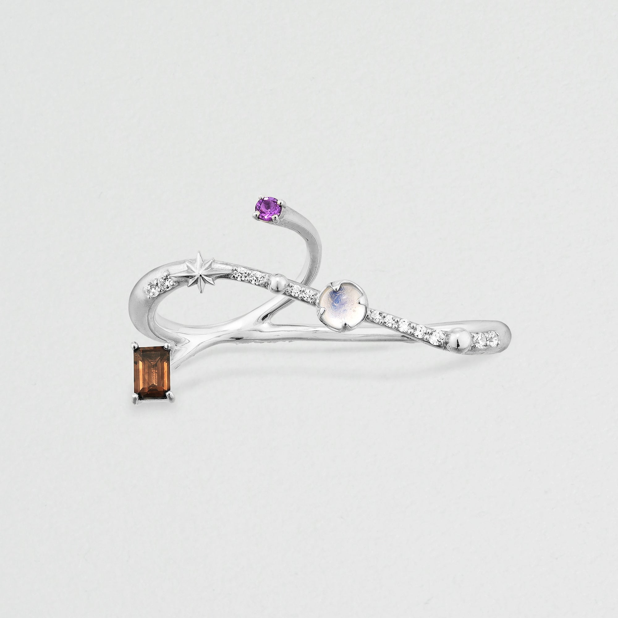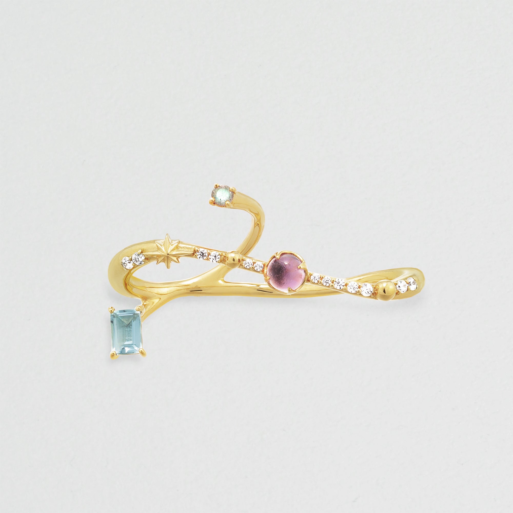 二つの宇宙船の出会いを象ったロマンティックなフォルムに浮遊するように、色とりどりのカラーストーンをあしらいました。