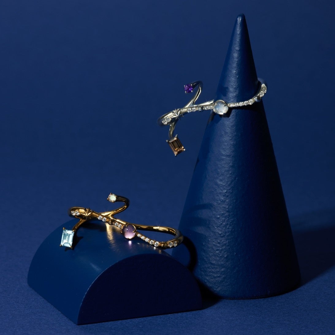 宇宙に煌めく星々を、彩りあふれる宝石で表現した「Cosmic GEM」。2025年ホリデー限定の新作は、宇宙船が互いに速度を合わせ同じ軌道上で接近するドラマティックな瞬間「Rendez vous(ランデヴー)」からインスパイアされた、ダブルフィンガーリング。