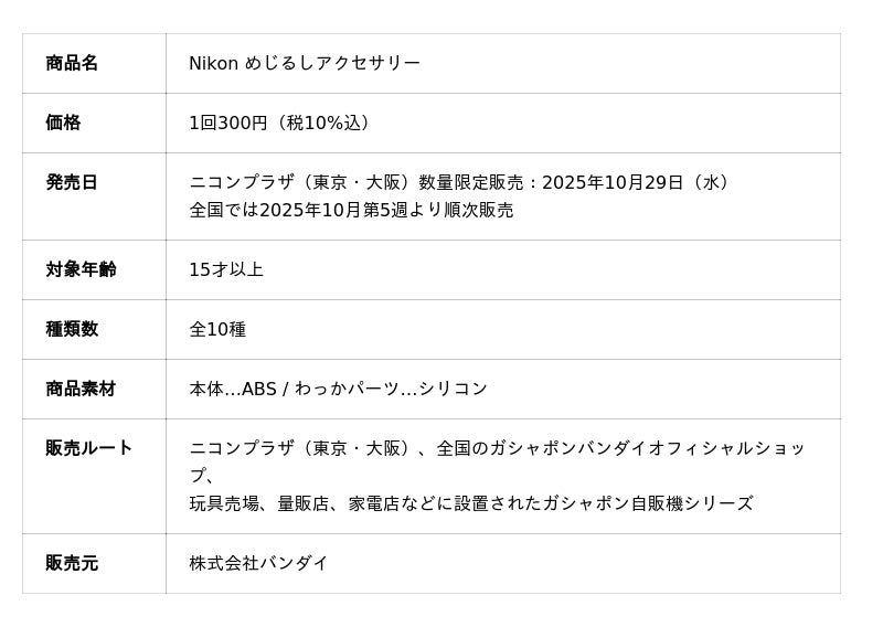 「Nikon めじるしアクセサリー」は、ニコンが製造・販売するカメラをカニカン&シリコンパーツ付きの全高約2.3cmにしたマスコットです。付属のカニカンとシリコンパーツを傘やペットボトルなどにつけることで、自分の持ち物の”めじるし”として使用することができます。本商品は2025年10月29日(水)より「ニコンプラザ東京」および「ニコンプラザ大阪」にて、数量限定で販売開始いたします。全国のガシャポンバンダイオフィシャルショップ、玩具売場、量販店、家電店などに設置されたガシャポン自販機シリーズでは、2025年10月第5週より順次販売されます。