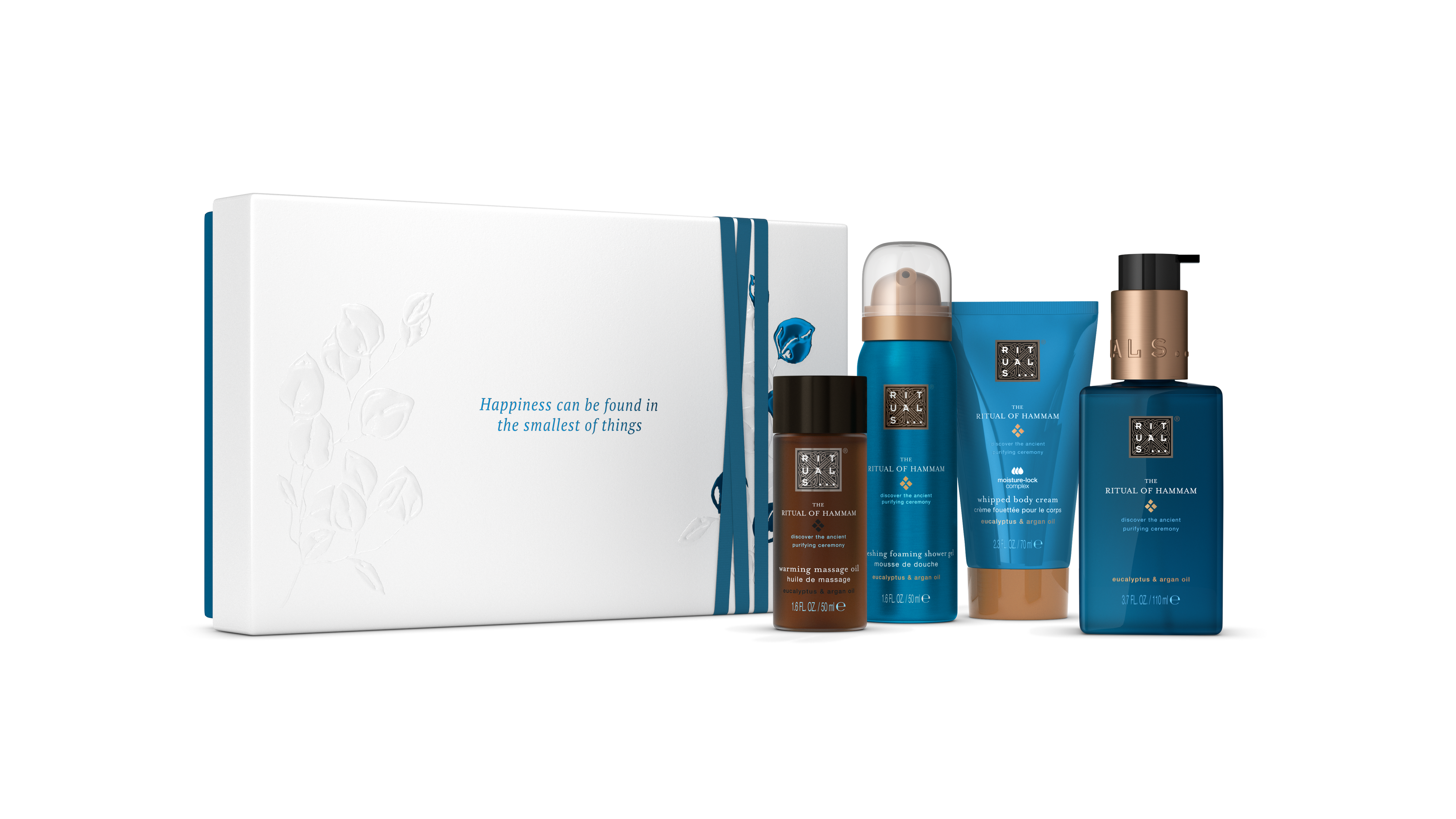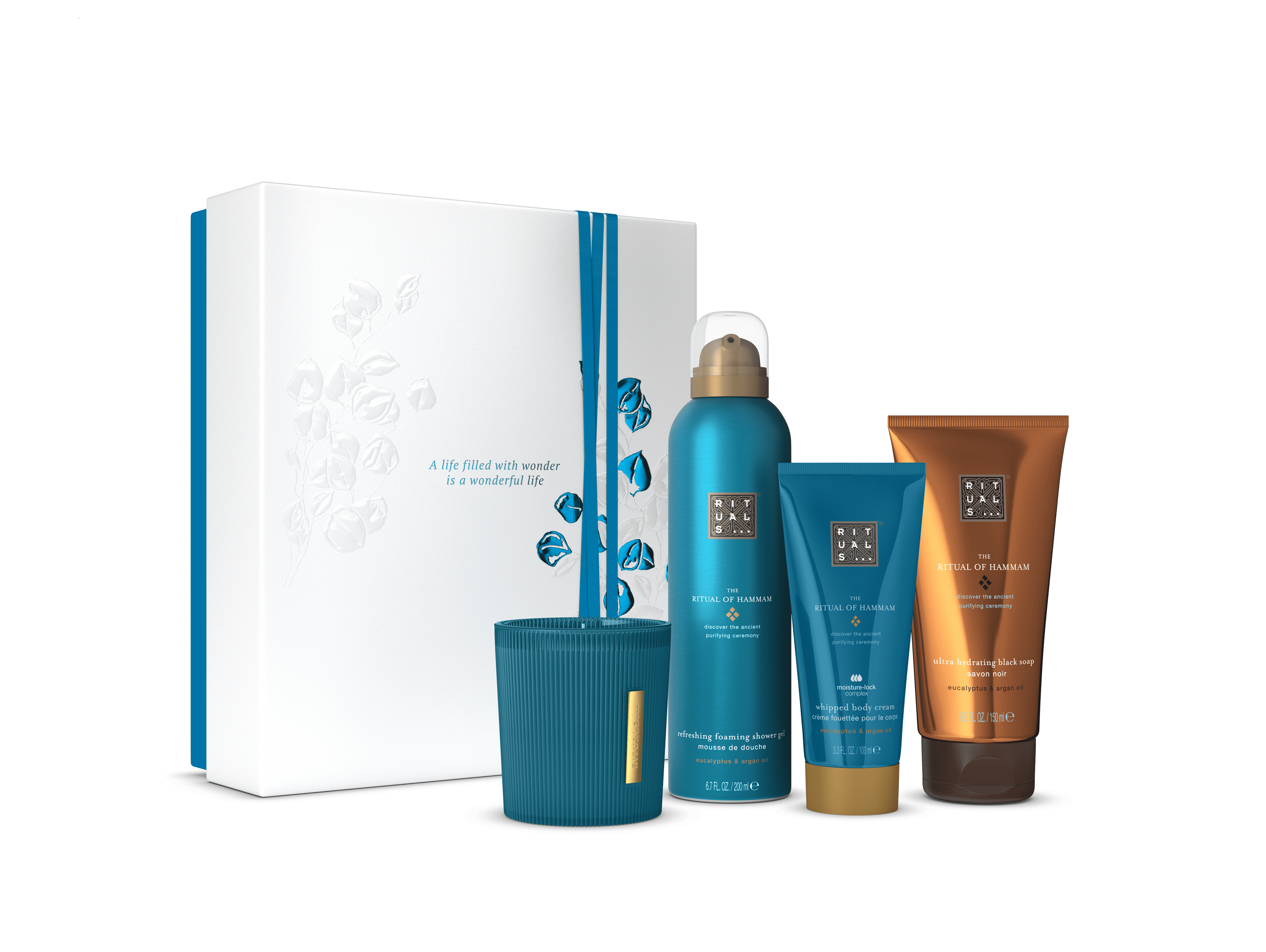 古代ローマ時代のトルコ式公衆浴場であるハマムからインスピレーションされたコレクション。アルガンオイル*1、ユーカリ*2を配合したアイテムは、肌にうるおいを与えながらミント、アロエベラ、サンダルウッドをブレンドしたアロマティックな香りによるリフレッシュをお楽しみいただけます。ご自宅でスパ体験を楽しむためのアイテムが全てそろうギフトセット。