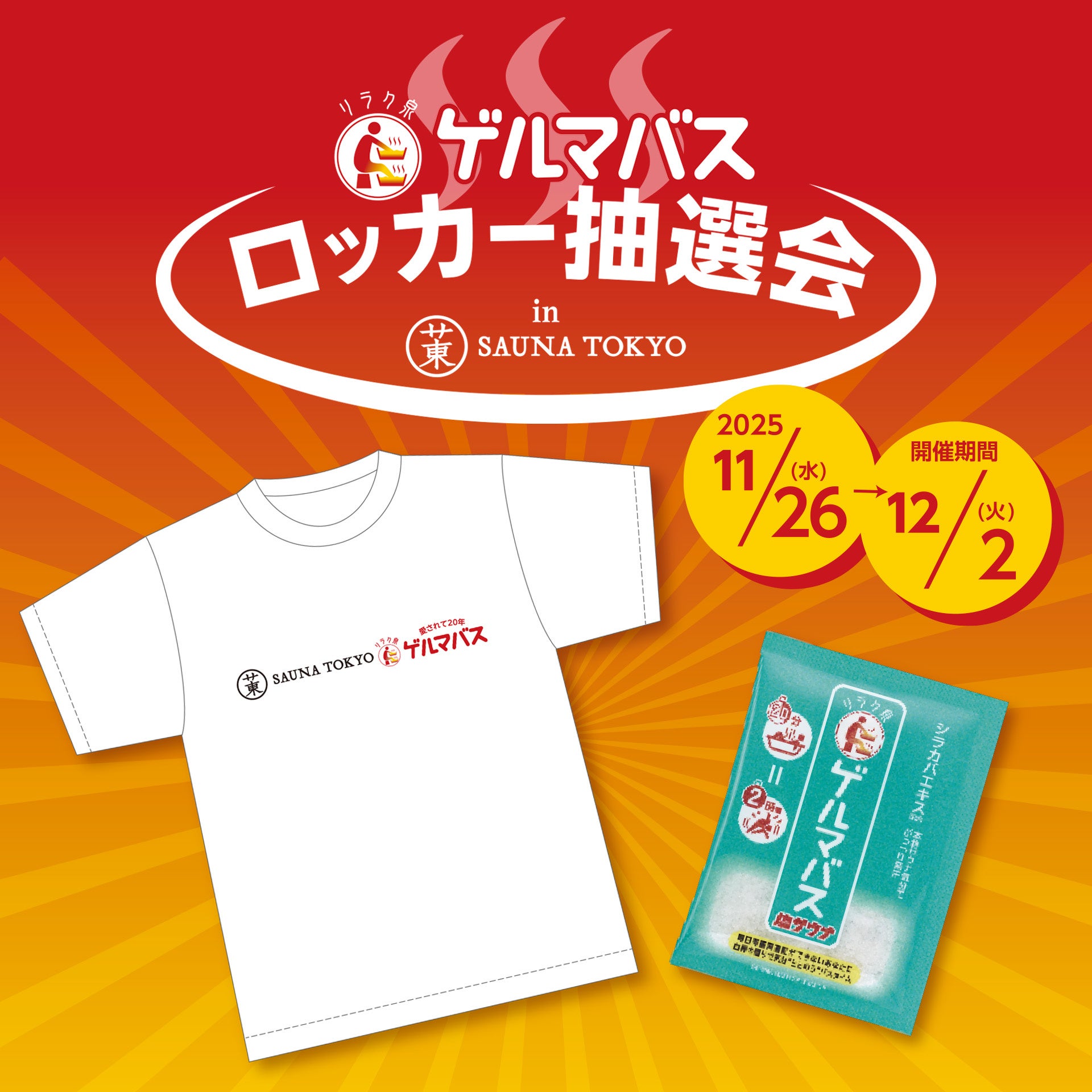 【サウナ東京】を利用する方限定で、リラク泉シリーズの「ゲルマバス塩サウナ」やコラボTシャツが当たる【ロッカー抽選会】の他、先着でコラボステッカーをプレゼント。