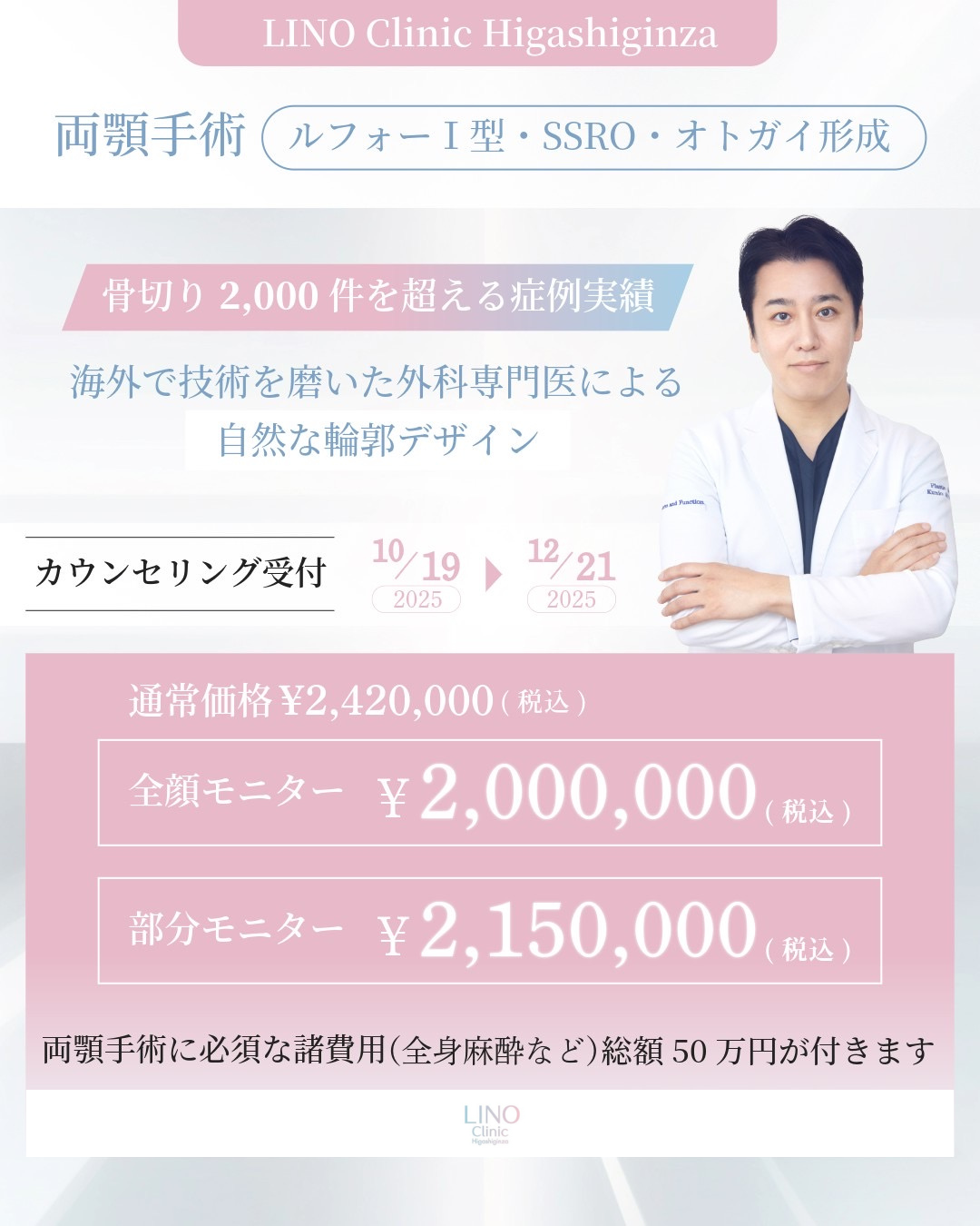 両顎手術に必須な諸費用(全身麻酔・模型代・骨切りシミュレーション・自己血輸血/総額約50万円)も含まれています。