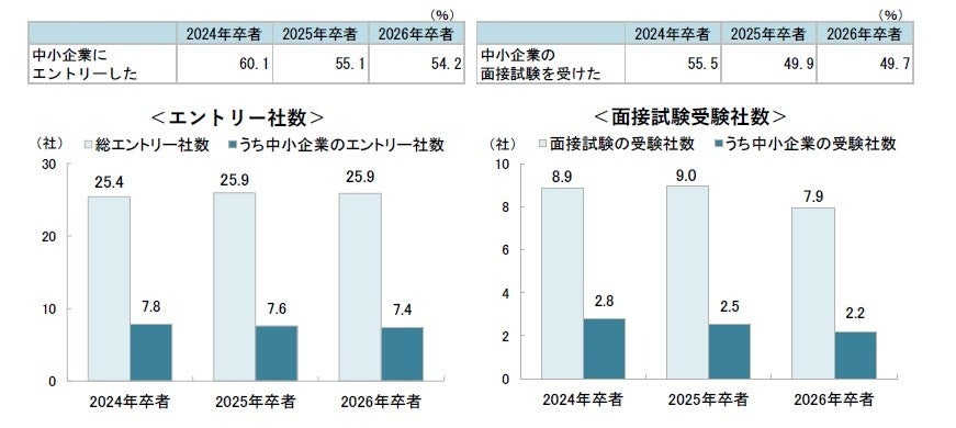○中小企業の面接試験を受けた学生は全体の49.7%。平均社数は2.2社。ともに前年より減少