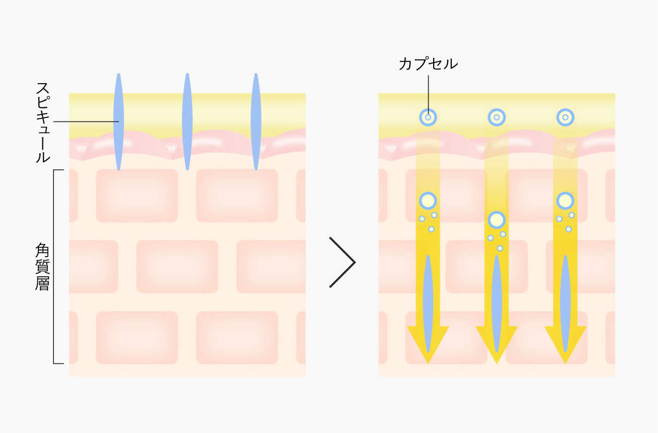 ■美容医療着想:天然由来のスピキュールで浸透の道しるべに海綿から抽出された天然由来のスピキュール(加水分解カイメン*⁵)を採用。肌への刺激を最小限にするために精製を繰り返し、サイズや形状を均一に整えました。それらが、成分の通り道を形成し、美容成分の浸透*²をサポート。また、角質層に留まる*⁸特性を活かし、持続的なハリ感のサポートをします。