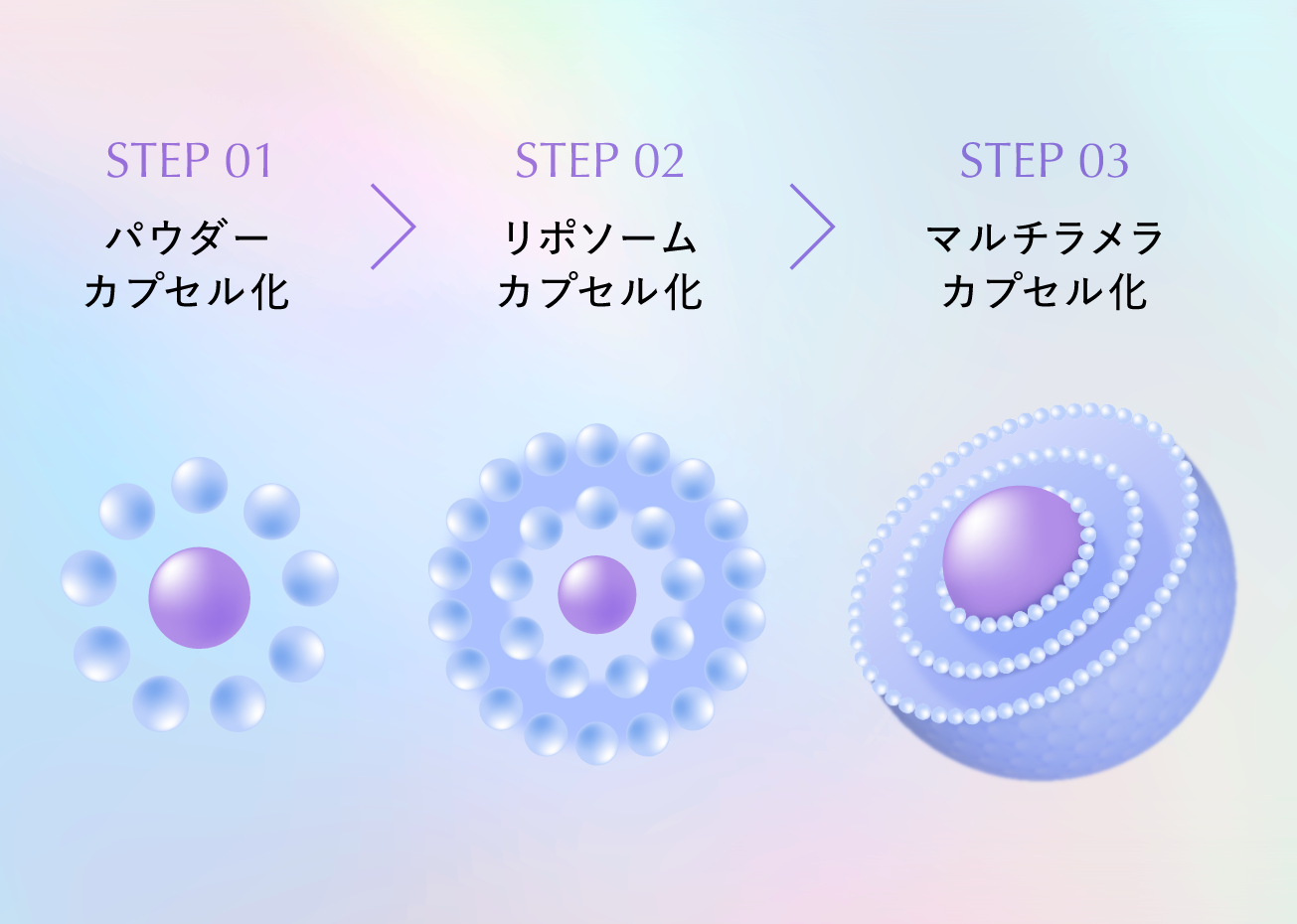 ■3重カプセル化されたレチナール*⁵を配合壊れやすく、安定化に課題のあるレチナール*⁵を3重のカプセルで覆うことで、角質層に届いてから作用を発揮する安定性を実現、肌へのスムーズな浸透を助けます。