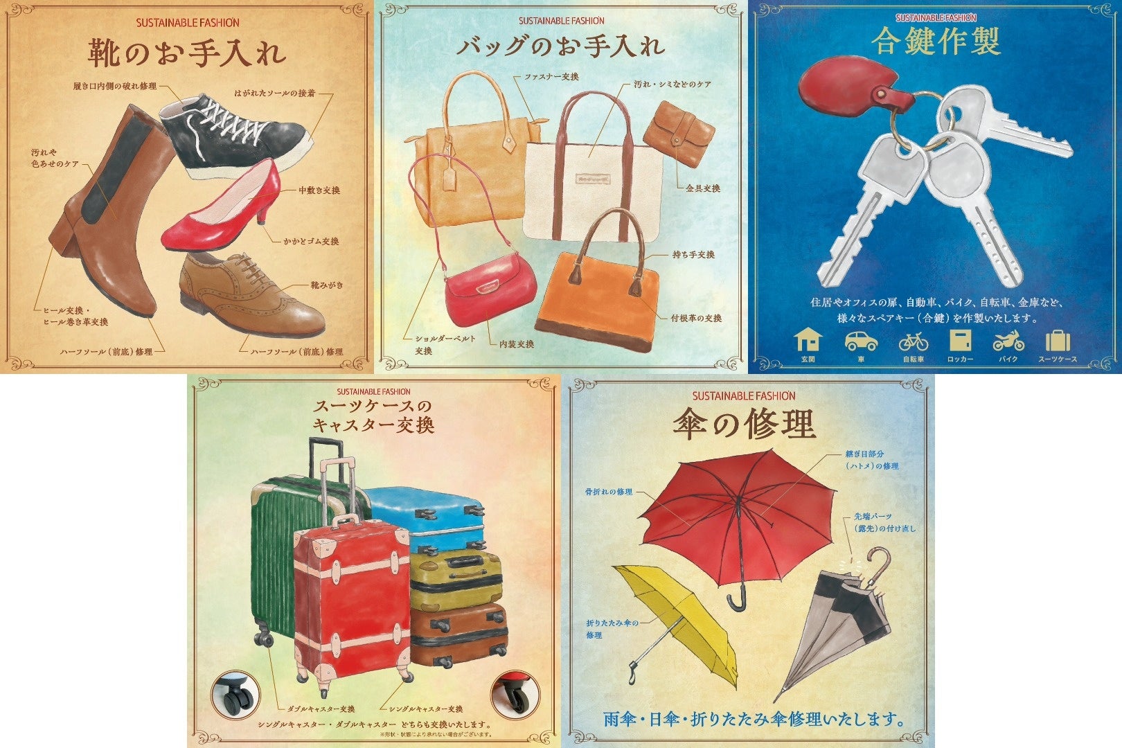 靴修理・靴クレンジング&ケア、バッグ修理・バッグクレンジング&ケア、靴・バッグケア用品販売、合鍵作製、スーツケース・キャリーバッグのキャスター交換修理、傘の修理。