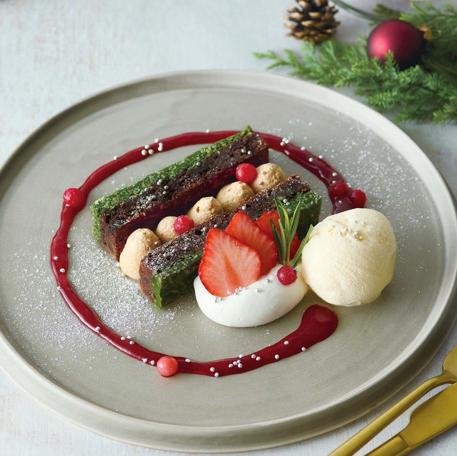 サクサクのパイに、軽い食感のバニラと宇治抹茶の2種類のクリームをサンドし、苺やブルーベリーをトッピングしたクリスマス限定のミルフィーユ。ミルクジェラートとともに。