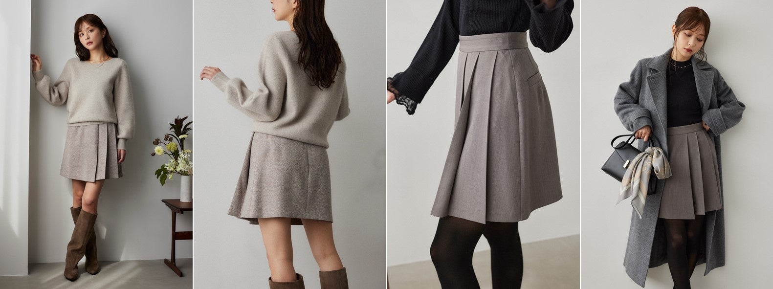 アシンメトリーなハーフプリーツで差がつく、大人のためのミニスカート。 3シーズン着こなせるように、万能なグレーとベージュをセレクト。