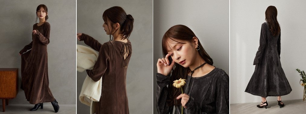 “冬の特別なシチュエーションに合わせて着こなしたい!”をコンセプトに、艶やかな質感とこだわりのシルエットで魅せるワンピースと、上品な佇まいに甘さを加えたプリーツスカートの2アイテムを展開します。