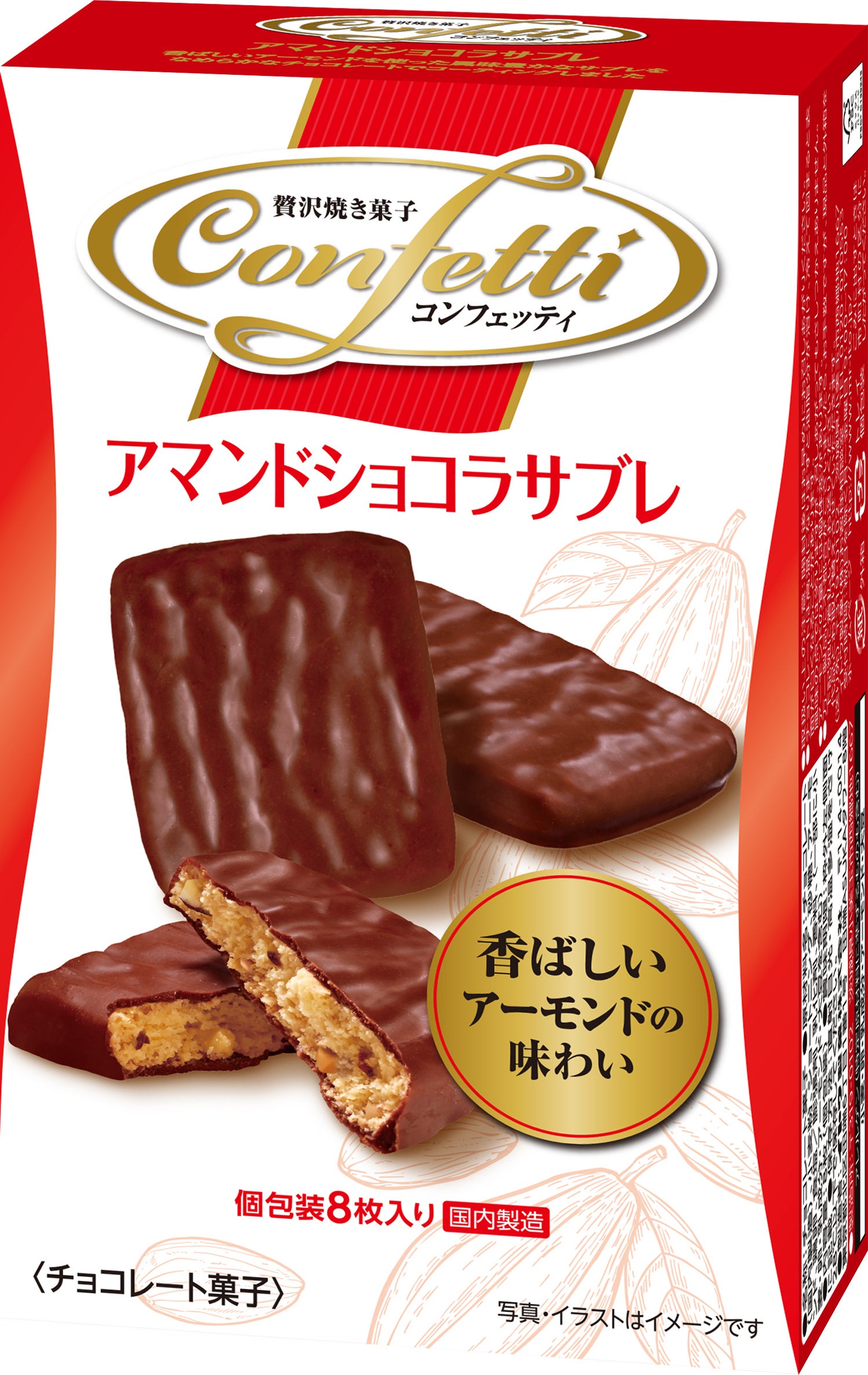 『コンフェッティ』は、焼き菓子専業メーカーとして培ったノウハウを結集し、原料と製法にこだわった高付加価値シリーズです。この度発売する「コンフェッティ アマンドショコラサブレ」は、香ばしいアーモンドを使った風味豊かなサブレをなめらかなチョコレートでコーティングした、期間限定のチョコレート菓子です。