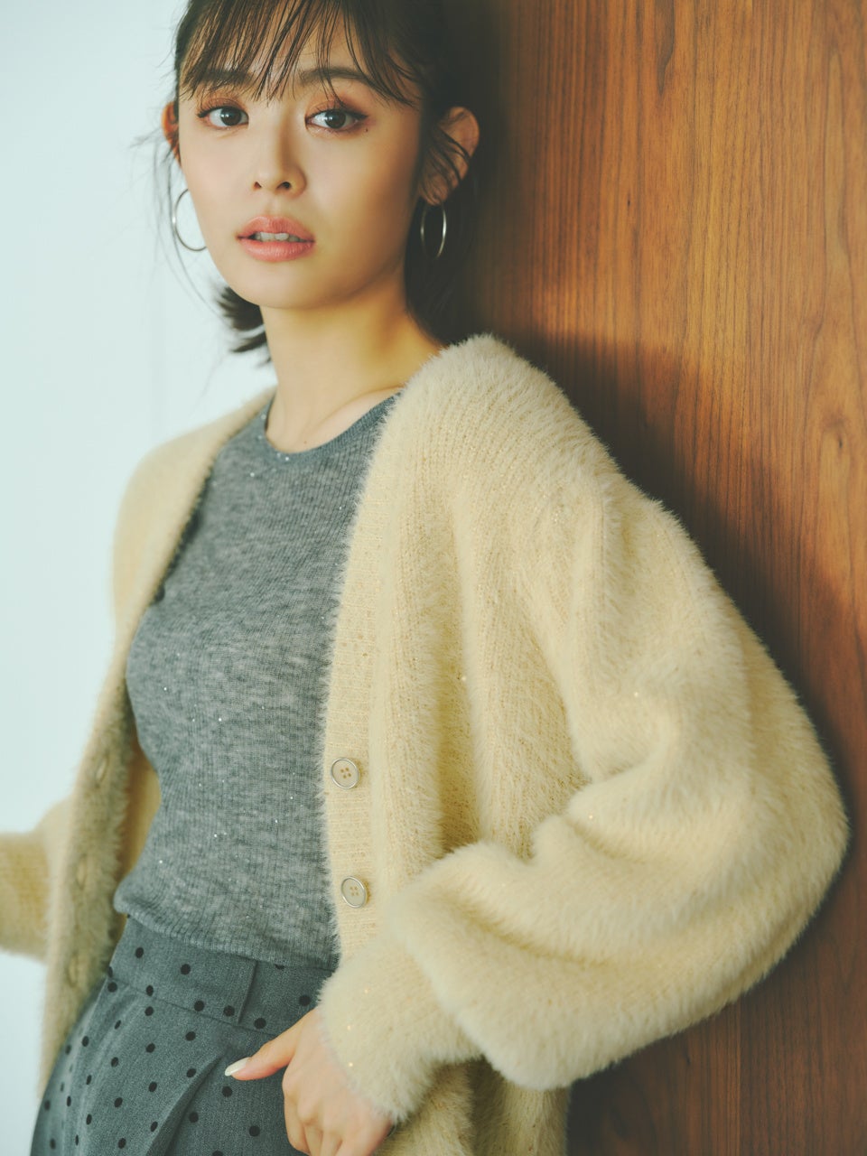 毛足長めのシャギーニットにスパンコールを散りばめたリッチな印象のカーディガン。