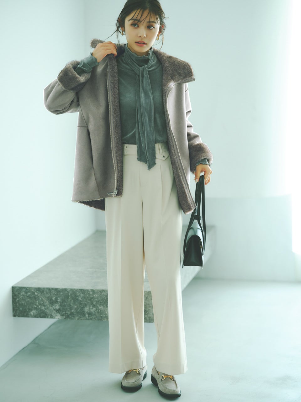 襟と袖口にレザー調の素材を取り入れた今年らしいデザインは、衿を立てた着こなしも素敵に決まる。