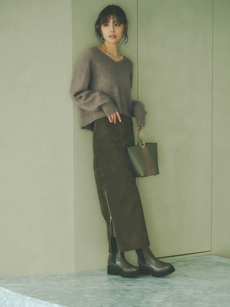 KNIT ENSEMBLE_¥26,400 SKIRT_¥18,700 BOOTS_¥24,200
