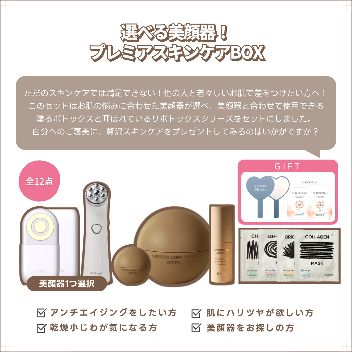 このセットはお肌の悩みに合わせた美顔器が選べ、美顔器と合わせて使用できる塗るボトックスと呼ばれているリポトックスシリーズをセットにしました。