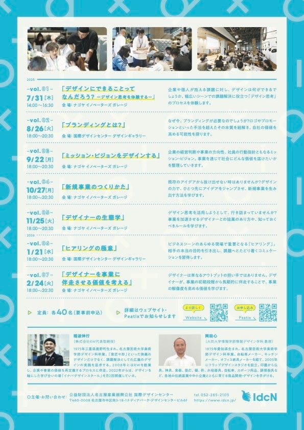 なごやデザインスクールは、国際デザインセンターが運営するデザインを軸とした小規模な学びの場です。あらゆることが複雑化する現代において、「デザイン」はもはやデザイナーだけのスキルではありません。日々の業務から新事業開発まで、幅広いシーンでの課題解決に役立つものです。デザインの経験を問わず、多様な業種・領域の人びとがともに学び、新たな気づきやコミュニケーションを育むことで、自ら課題を解決するデザインリテラシーの向上を目指していきます。https://www.idcn.jp/projects/school/