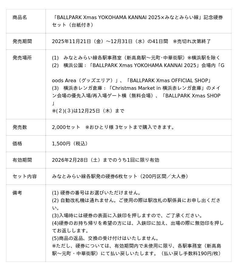 「BALLPARK Xmas YOKOHAMA KANNAI 2025」イベント限定デザイン記念硬券セット発売&ラッピングトレインを運行