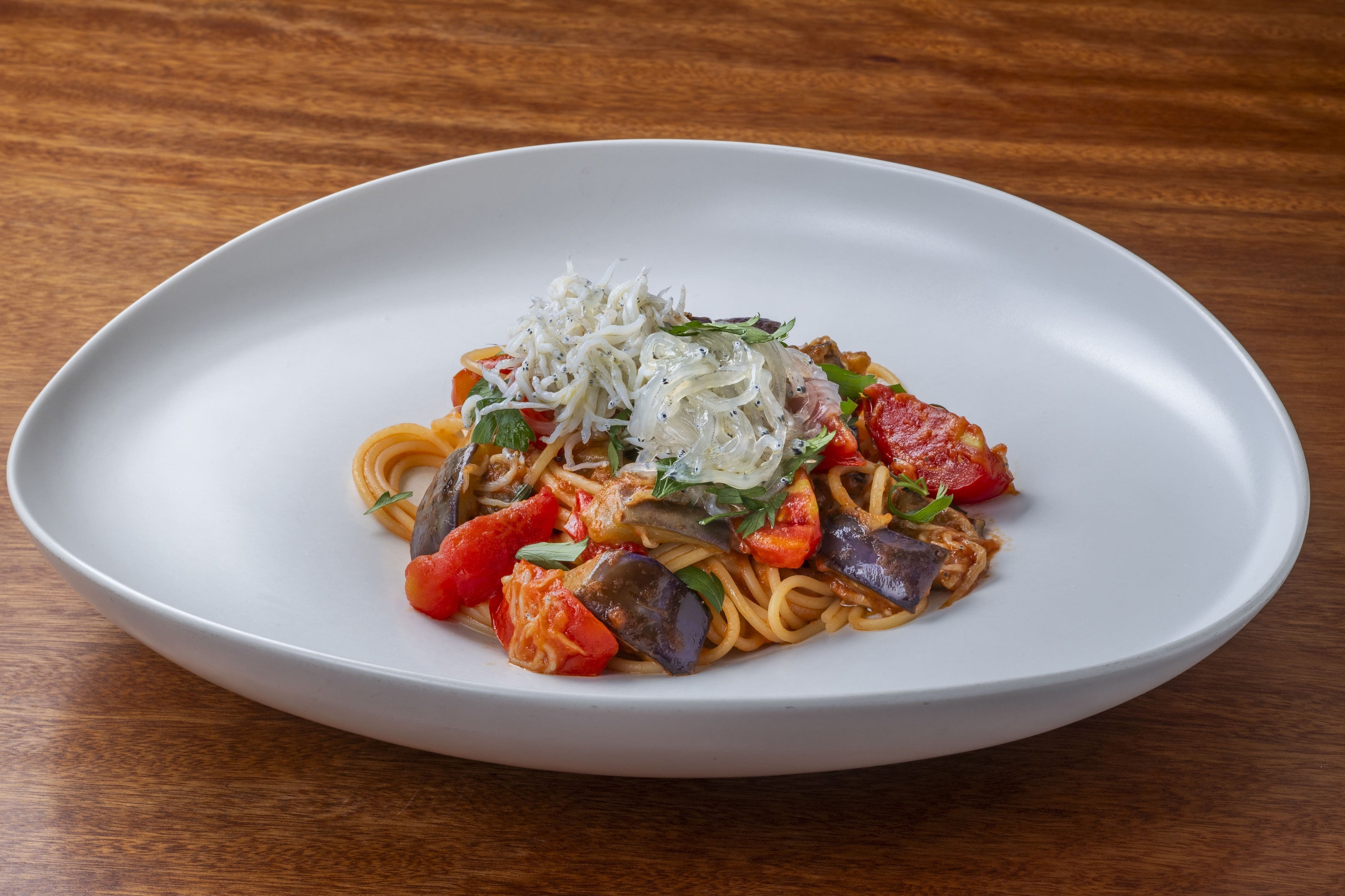 静岡市産のブランドなすとレッドオーレトマトのスパゲティに、駿河湾直送の釜揚げと生のしらすをたっぷりのせています。ランチコースや夜のアラカルトで堪能できます。
