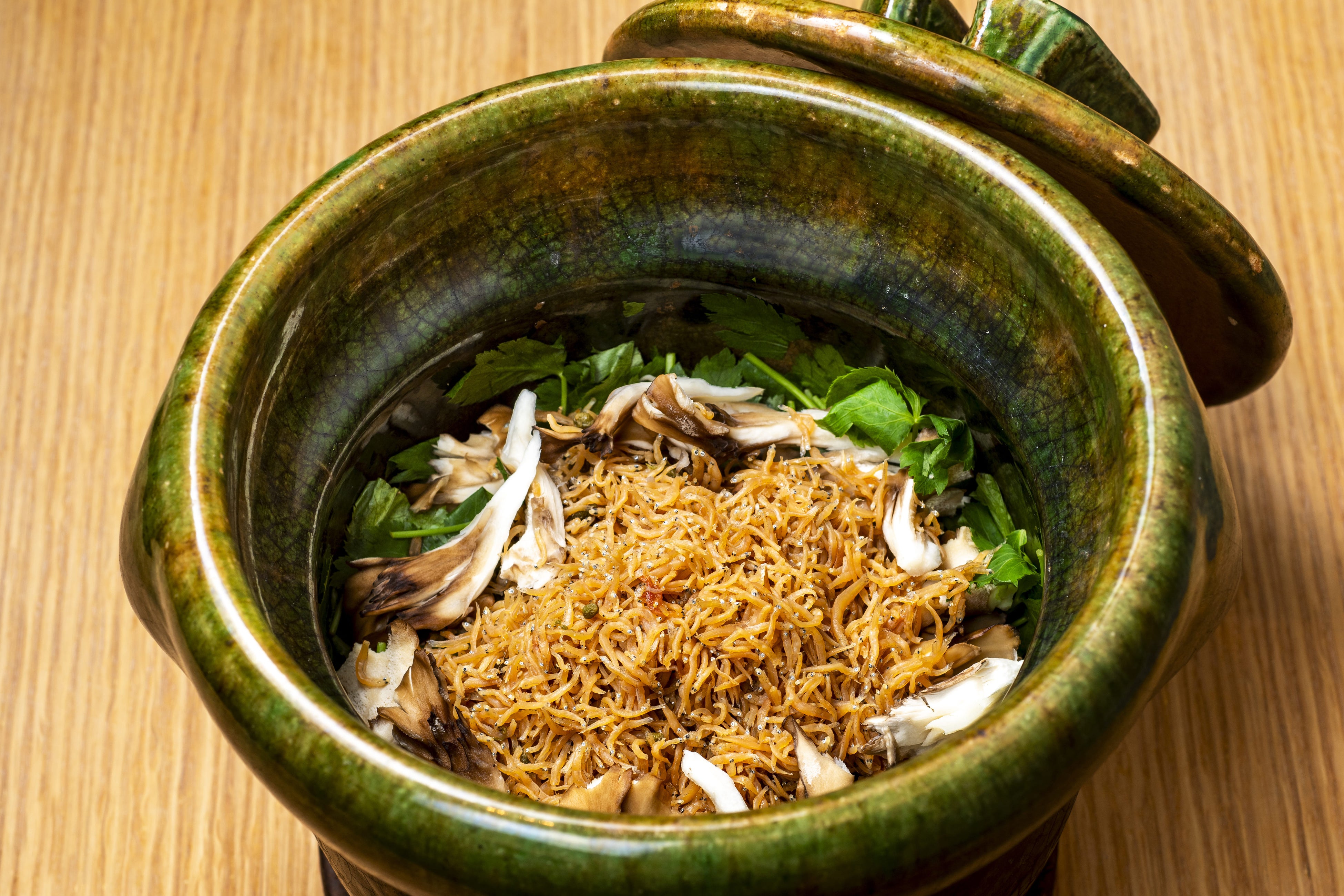 静岡市で育て継がれる徳川家康公ゆかりの伝統野菜「折戸なす」。折戸なすと桜えびをぜいたくに使い、にんべんのだしで炊きあげた期間限定のだし炊き込みご飯は絶品です。※数量限定
