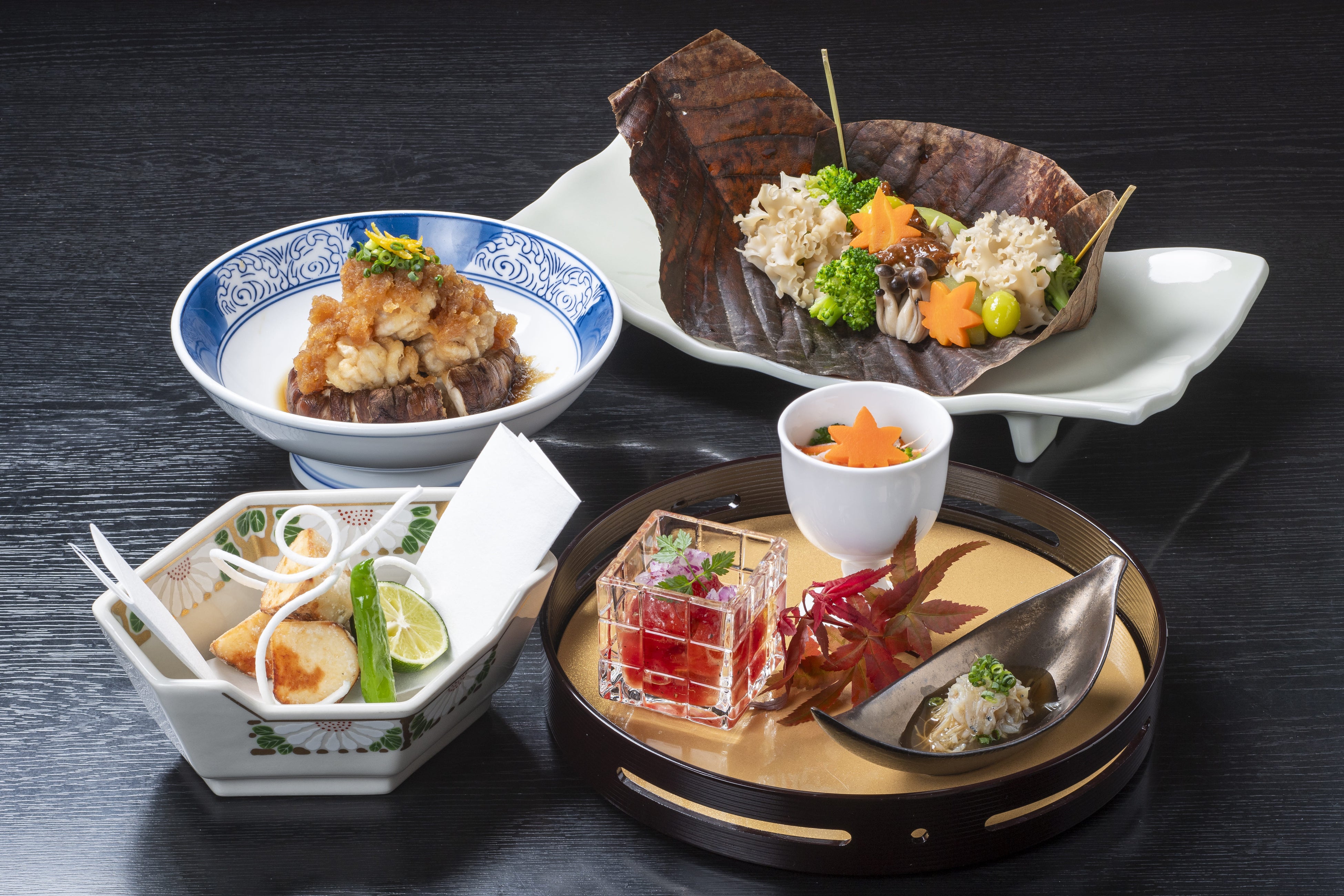 藤枝市の農家直送の椎茸はしんじょに仕立て清水特産の銀杏を添えています。折戸なすの田楽やしらす・トマト・ホホホタケのドレッシング仕立て、柚子のゼリー寄せまで。しずおか中部の食材を活かす日本料理の粋を楽しめます。※要予約