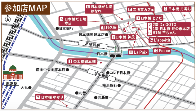 ◆参加店舗(50音順):榮太樓總本鋪、DA GOTO、日本橋 神茂、日本橋 蛇の市本店、日本橋だし場 本店、日本橋だし場 はなれ、日本橋 とよだ、日本橋 舟寿し、日本橋ゆかり、Peace、文明堂カフェ、平ちゃん、La Paix、 L’appetit、利久庵