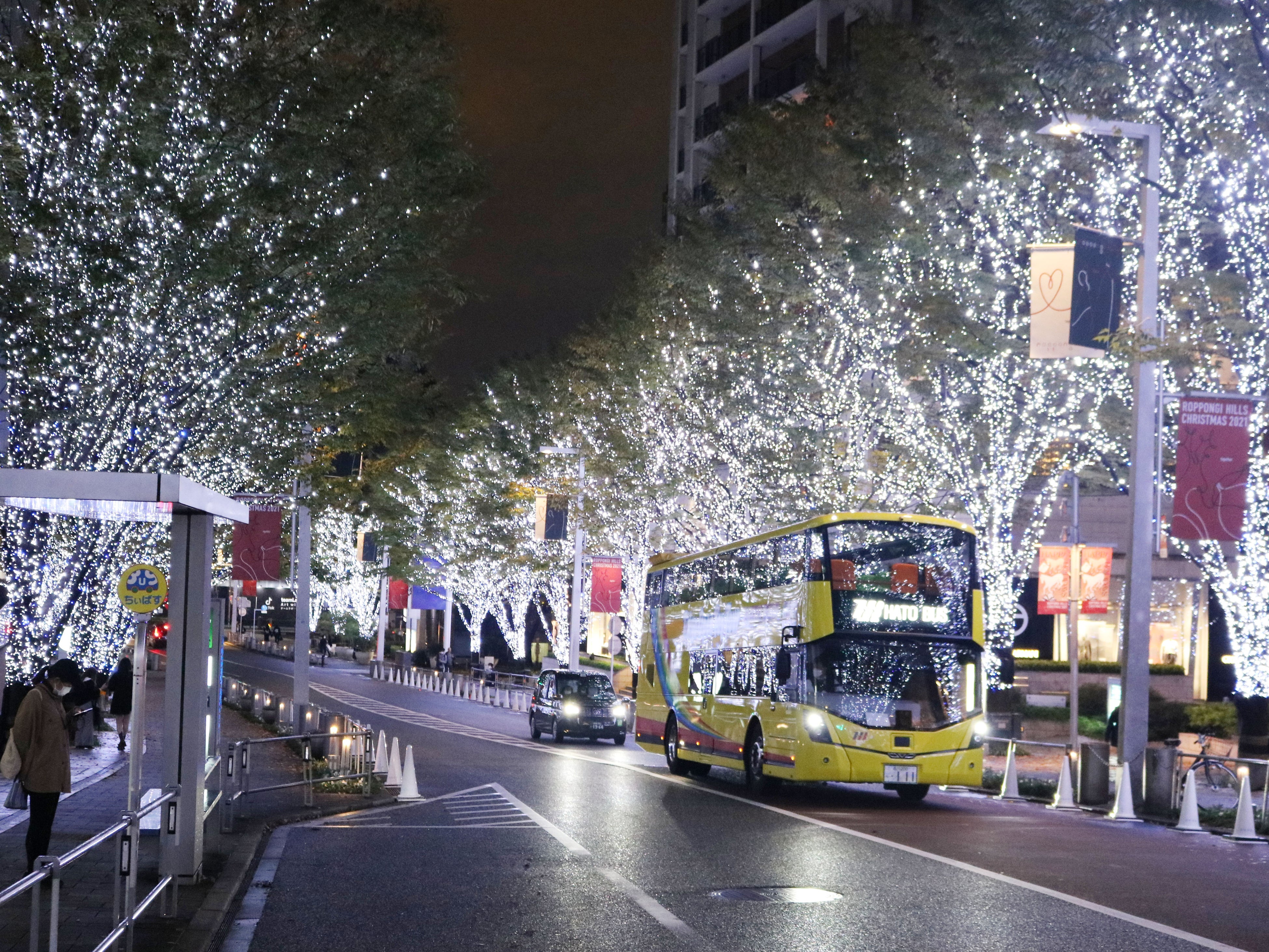 大人気の2階建てオープンバスコース。約2時間で六本木ヒルズ・東京シティビューからの東京の夜景の展望に、都内屈指のイルミネーションのトンネルのドライブをオープンバスでお楽しみください。