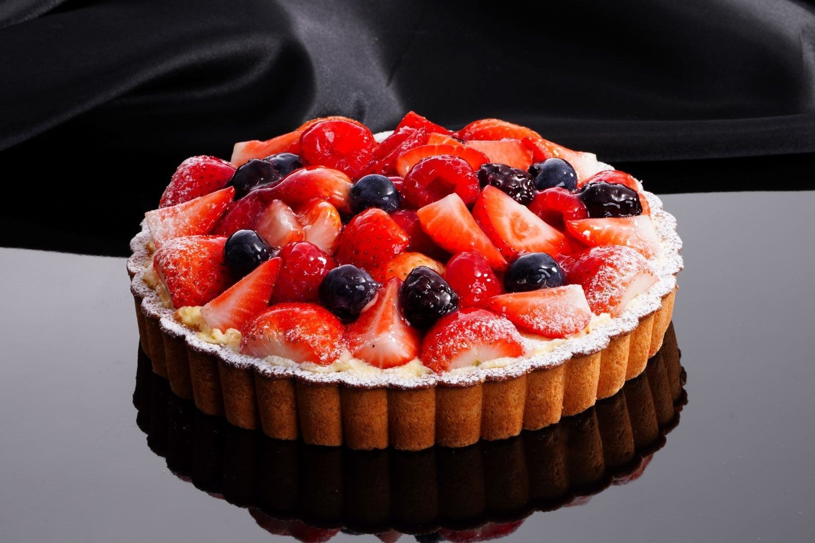 香ばしく焼き上げたタルト生地の上に、アーモンドクリームとカスタードクリームを重ね、ブルーベリー・ラズベリー・ブラックベリー・ストロベリーの色とりどりのベリーを敷き詰めました。