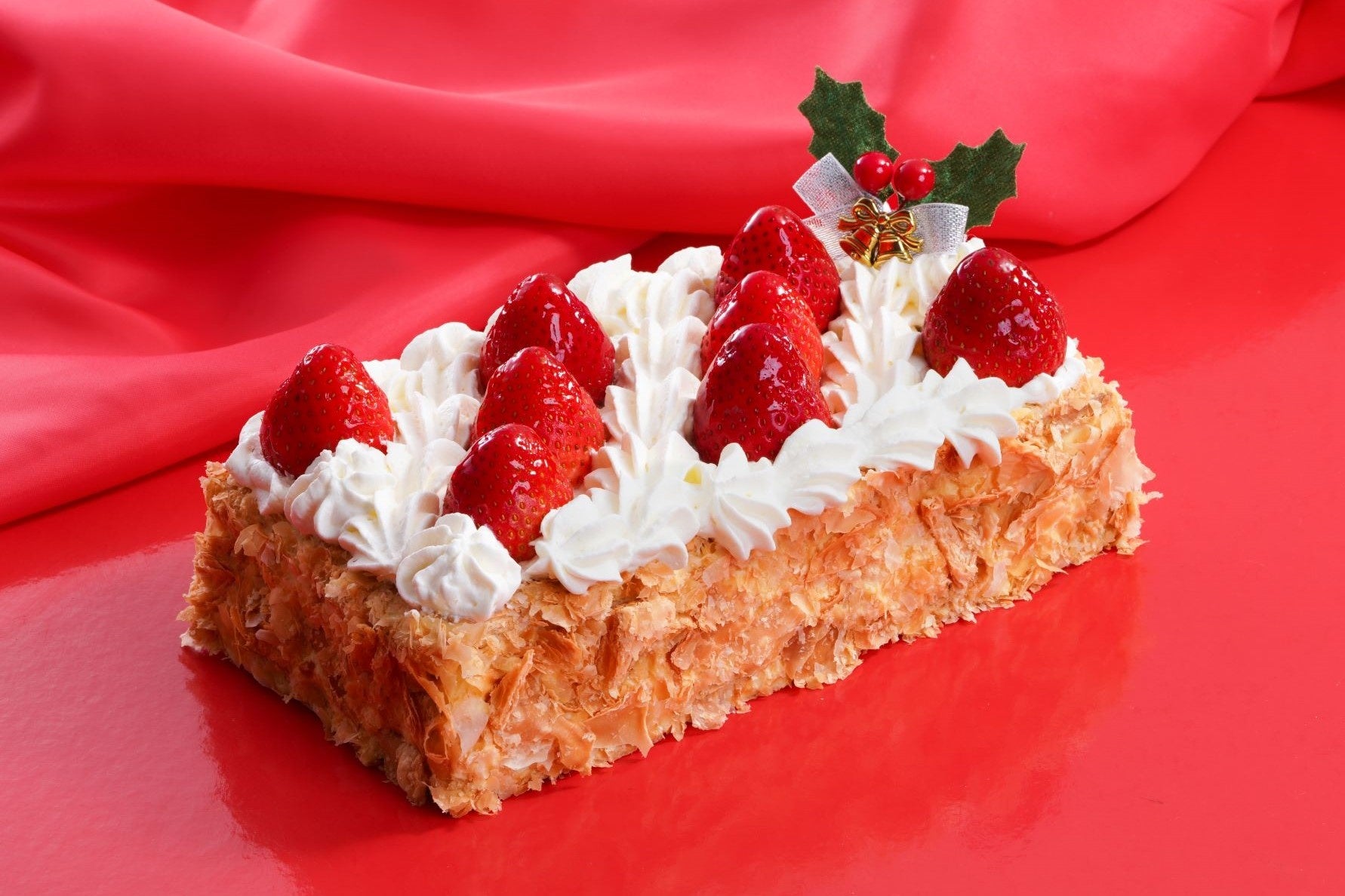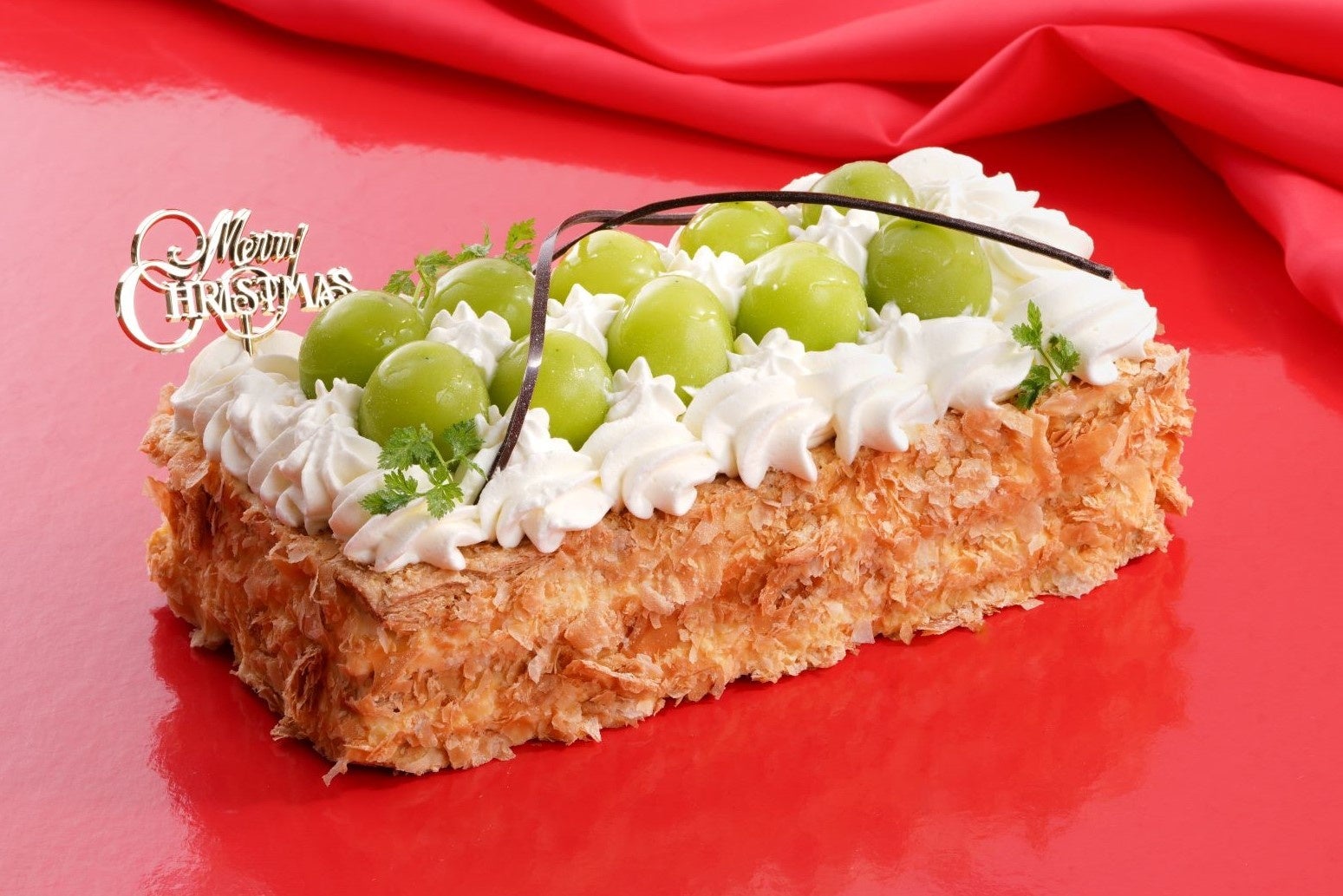 食感の重なりが楽しい、華やかなミルフィーユです。香ばしいパイ生地の間に、爽やかなシャインマスカットと上品なカスタードクリームをサンド。パイの芳醇な香りとみずみずしい果実が絶妙なバランスで溶け合い、クリスマスのテーブルを彩る上質なデザートです。