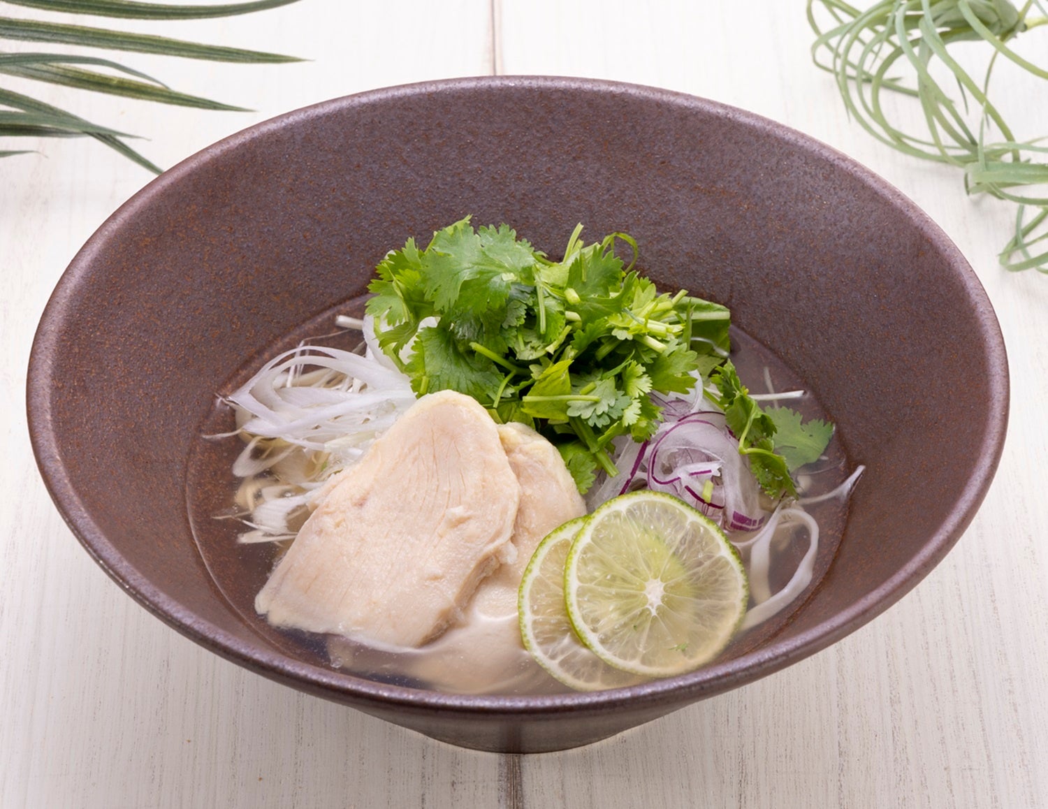 パクチーがたっぷり乗ったあったかメニュー。つるつるとした麺と旨みたっぷりのスープで、優しい味わいながらも満足感のあるフォーです。
