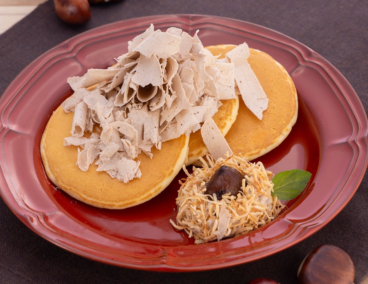 ホイップしたバターと熊本県産の渋皮栗ペーストをフローズンしたマロンバターを、たっぷりとパンケーキの上に削りかけたのが特徴。時間の経過と共に溶けたマロンバターのコクがどこから食べても感じられます。お好みで食感のアクセントにココナッツの果肉を細かく削って乾燥させたココナッツロングと、マロンホイップをつけて召し上がりください。