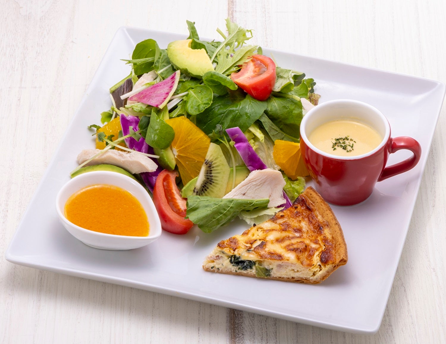 鶏肉とフルーツを主役にした、野菜たっぷりのプレート。キッシュは店内仕込みで、グラタンのようなとろとろした食感が特徴です。