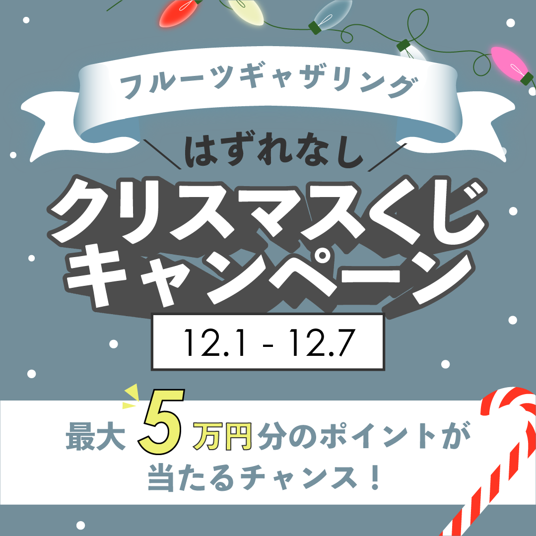 フルーツギャザリングでは、今年一年のご愛顧への感謝を込めて、“はずれなし”のクリスマスくじキャンペーンを公式アプリにて実施いたします。