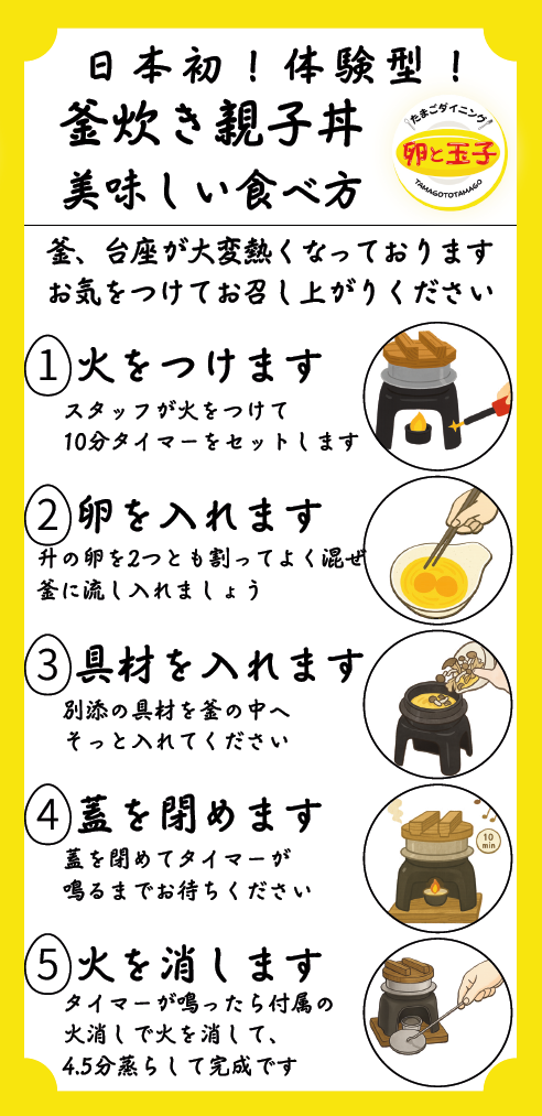 “日本初の体験型 釜炊き親子丼”の楽しみ方を紹介。お客様自身で火をつけ、卵を割り入れ、炊き上げることで完成する“参加型の食体験”です。
