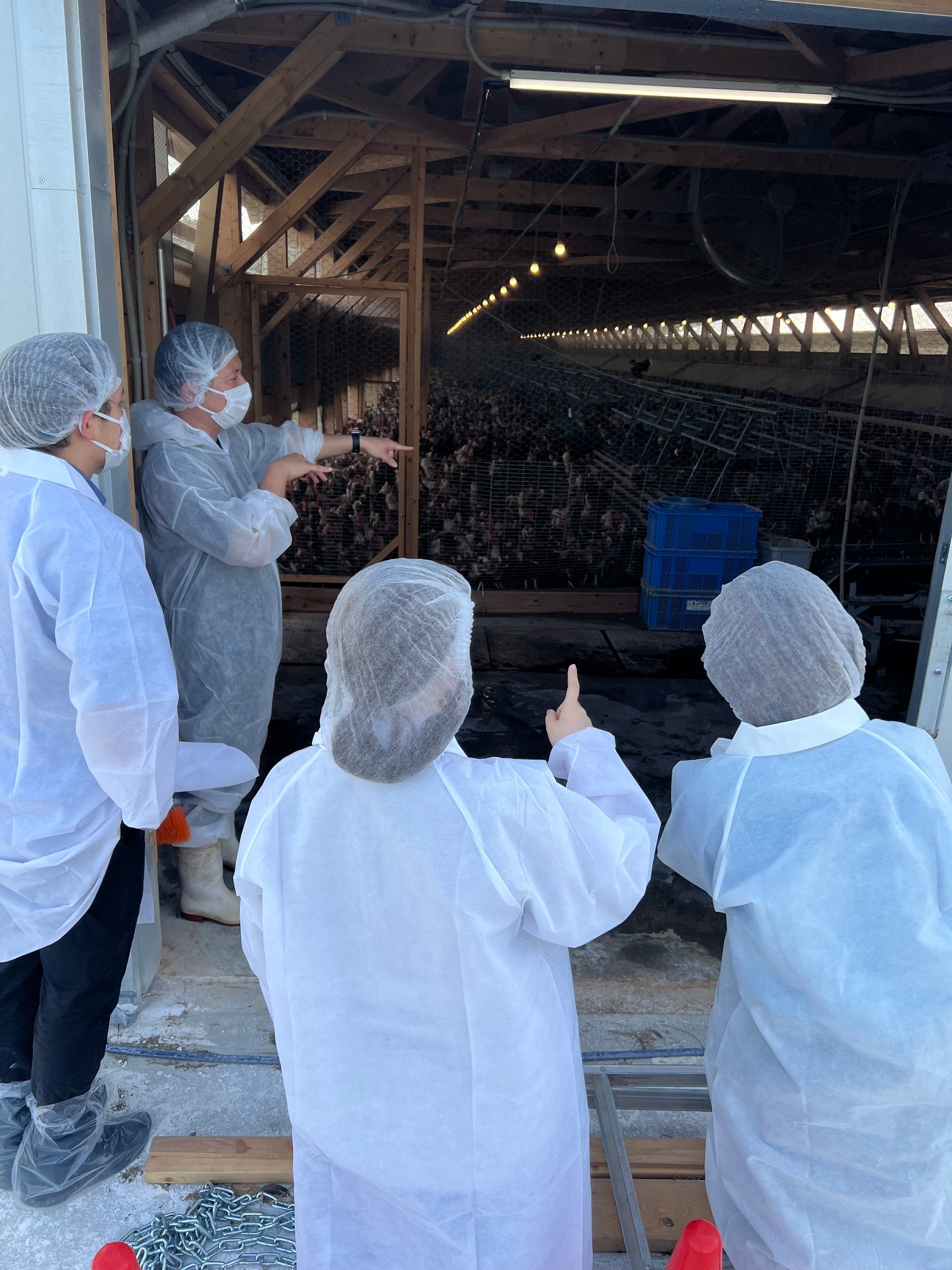 契約養鶏場「デイリーファーム」を訪問。獣医師の管理体制や鶏舎の衛生環境を確認し、生産現場の誠実な取り組みを学びました。