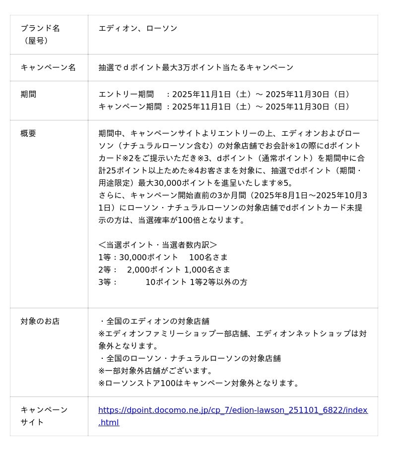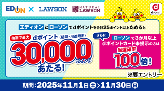 株式会社NTTドコモ(以下、ドコモ)は、エディオン・ローソンにおいて「抽選でdポイント最大3万ポイント当たるキャンペーン(以下、本キャンペーン)」を、2025年11月1日(土)から2025年11月30日(日)までの期間で開催いたします。