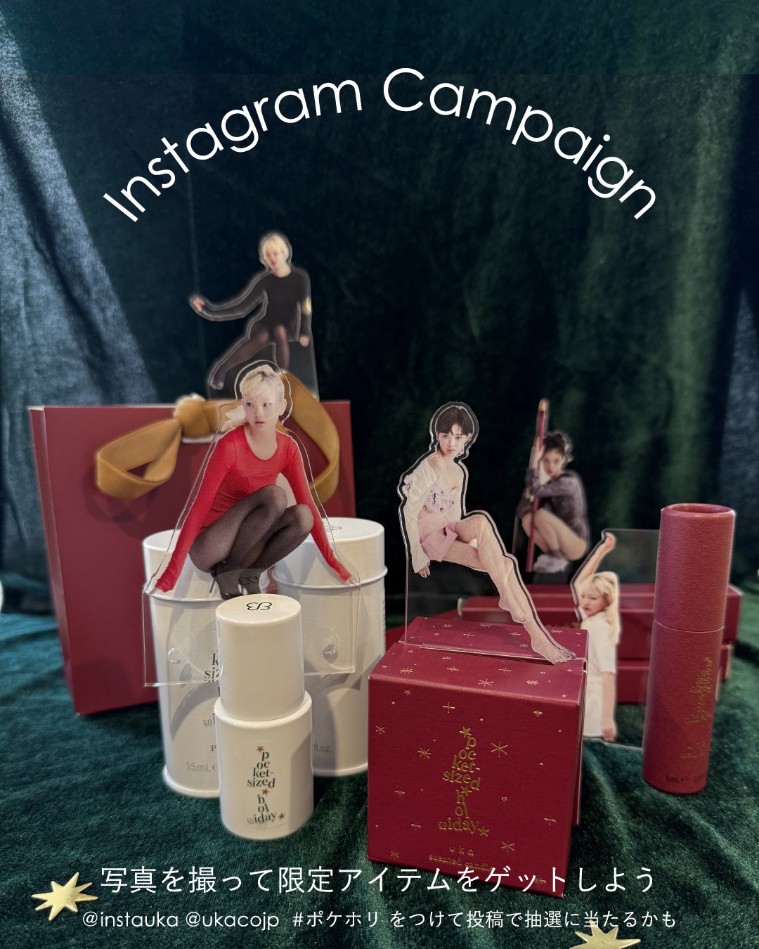 #ポケホリ をつけて @instauka または@ukacojp をタグ付けして投稿していただいたくと、抽選で 16 名さまにホリデーコフレのアイテムをランダムで 1 個プレゼントさせていただきます。