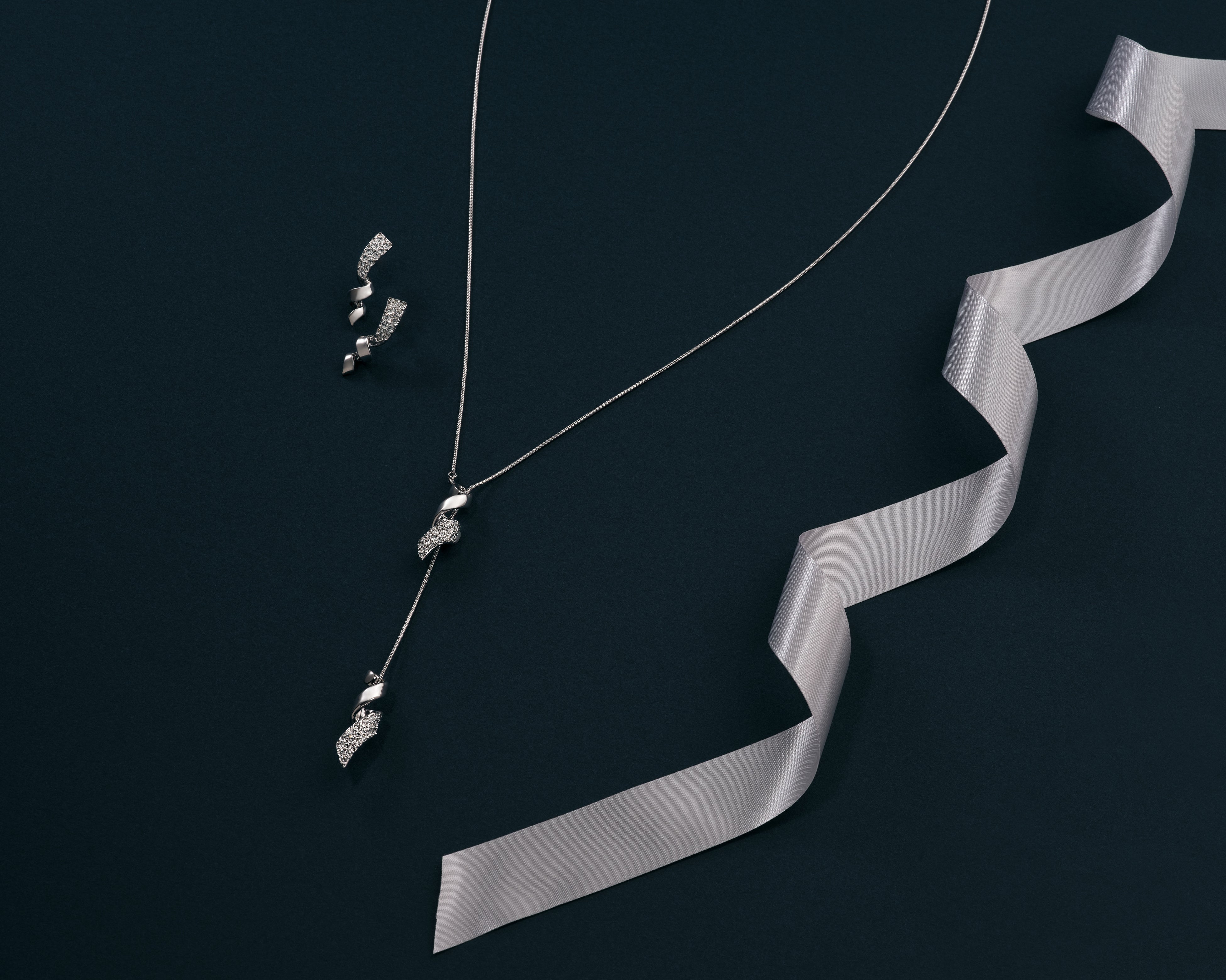 ホリデーシーズンに欠かせないリボンをモチーフに、しなやかな螺旋のラインで立体的に表現したアクセサリーが登場。動きのある軽やかなフォルムに、星空のような煌めくカットガラスをあしらい、装いに上質なアクセントを添えます。