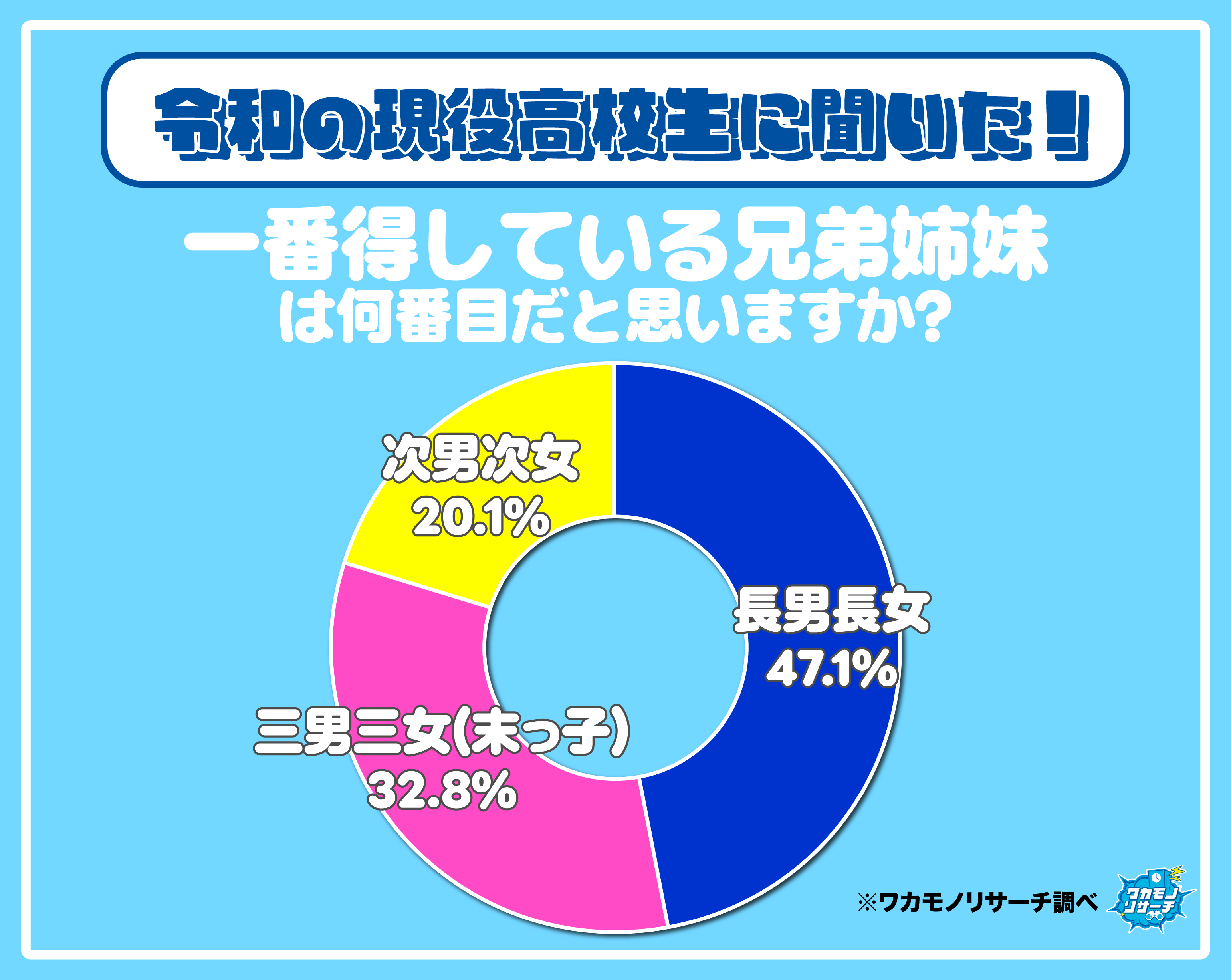 全国の14歳~20歳の若者(男女)に「一番得している兄弟姉妹は何番目か」について調査を実施