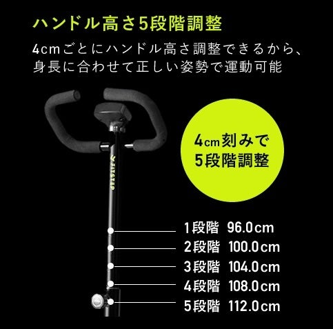 年齢・性別問わず皆様が乗りやすいよう、4cmごとにハンドル高さを5段階で細かく調整が可能です。そのため、身長に合わせて正しい姿勢で運動ができます。