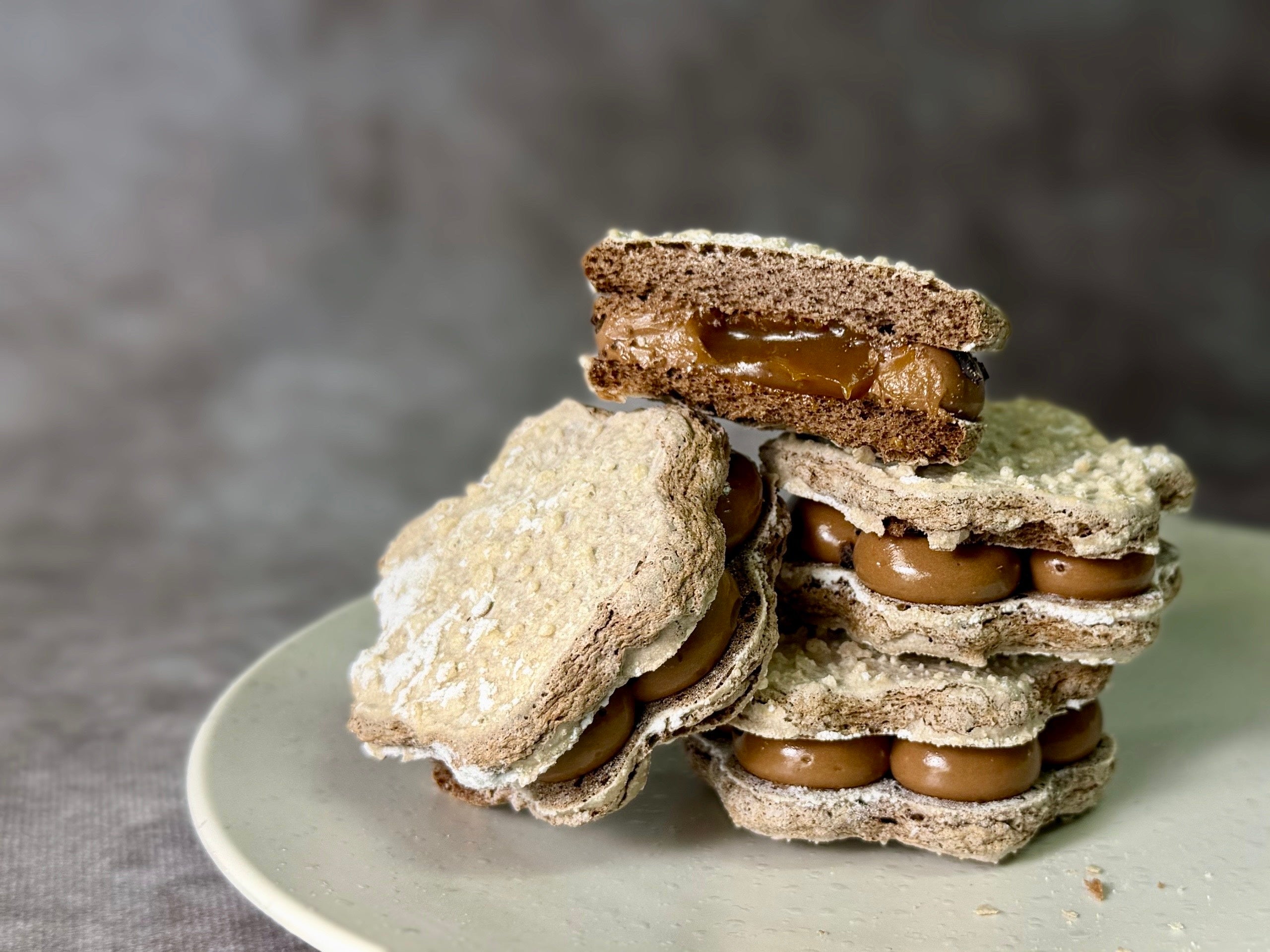 2.大丸東京店限定『ビスキュイバターサンドキャラメルショコラ』。さっくりと軽く焼き上げたショコラのビスキュイにベトナム産カカオのチョコレートで作ったバタークリームとなめらかなキャラメルをサンド。濃厚でほんのりビターなカカオとキャラメルによるパティスリーだからこそできる、手作りで繊細な味わいのバターサンド。チョコレート好きに食べていただきたい限定商品です。