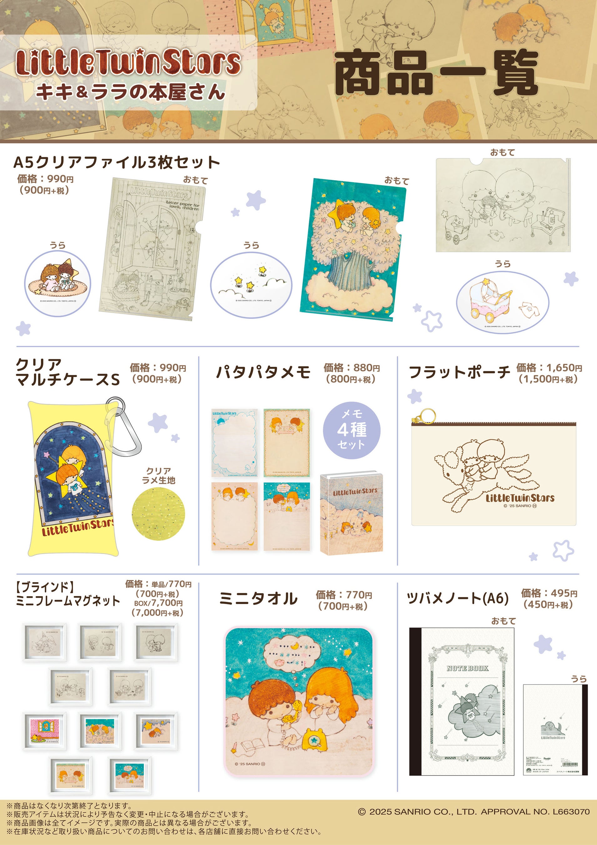 2025年に50周年を迎えた、株式会社サンリオの人気キャラクター『リトルツインスターズ(キキ&ララ)』のアートブック「トゥインクル ドリームズ キキ&ララ アートブック」の発売に合わせ、初期のイラストを使った書店限定グッズを企画しました。セピアカラーの髪色とレトロな色合い、手描きの柔らかい雰囲気が魅力のアイテムを7種類ご用意しています。