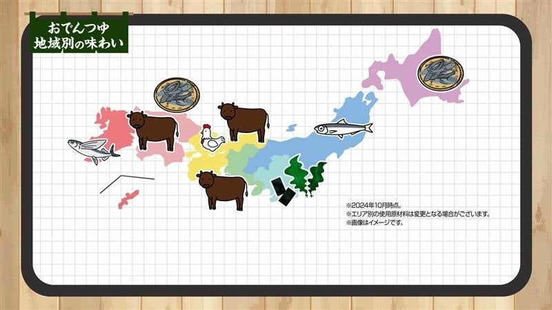 セブン‐イレブンのおでんつゆは、全国7つの地域ごとに食文化に合わせて設計。北海道の「煮干」、東北・信越の「いわし」、関東の「昆布」、東海の「牛」、関西・北陸「牛、鶏」、中国・四国の「煮干、牛」、九州・沖縄の「あご」と、地域の味を生かしただし原料を使用しています。